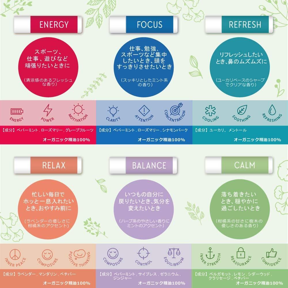 アロマスティック 携帯アロマ / アロマディフューザー ( オーガニック 精油 / エッセンシャルオイル / ヴィーガン ) 癒し / リラックスグッズ 全6種各1個セット