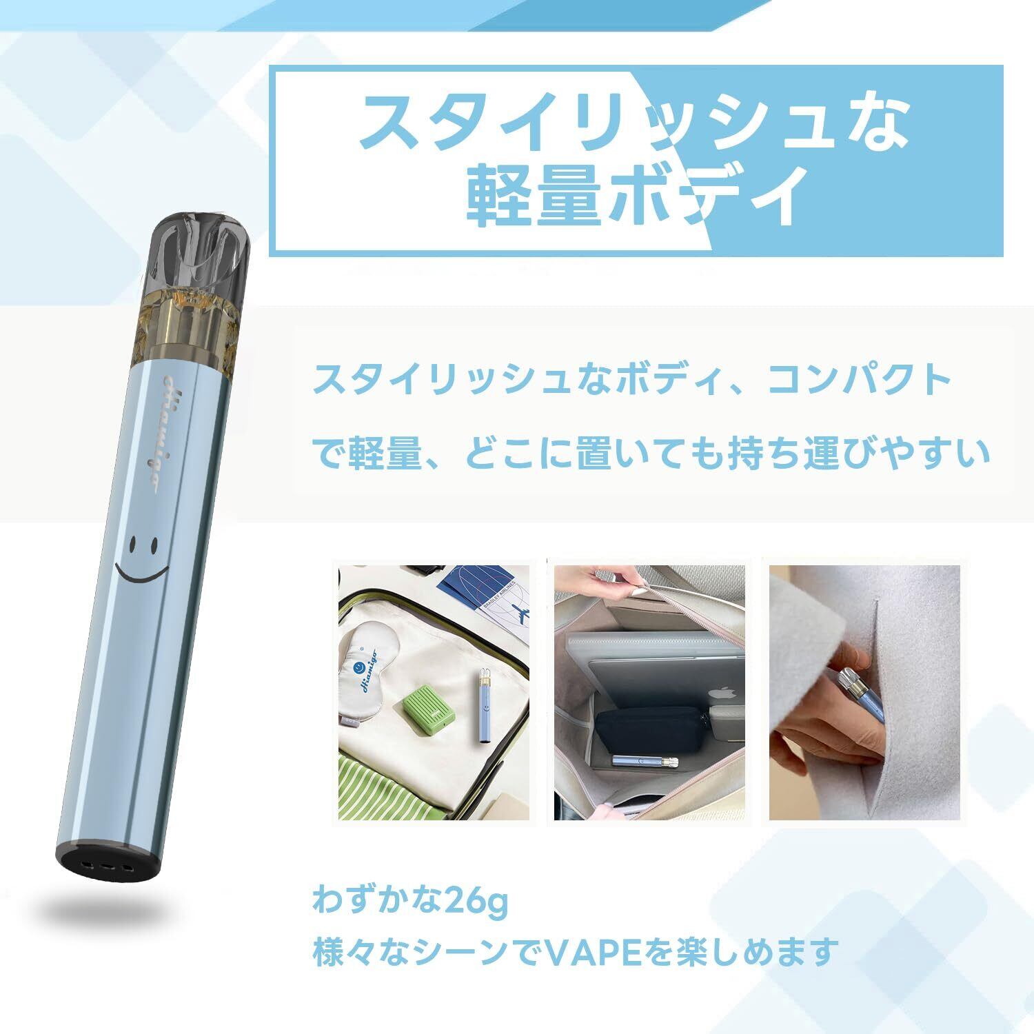 吸うだけで即起動、充電不要、いつでも・どこでもリフレッシュできる使い切りタイプ。1本あたり700回吸引可能です。