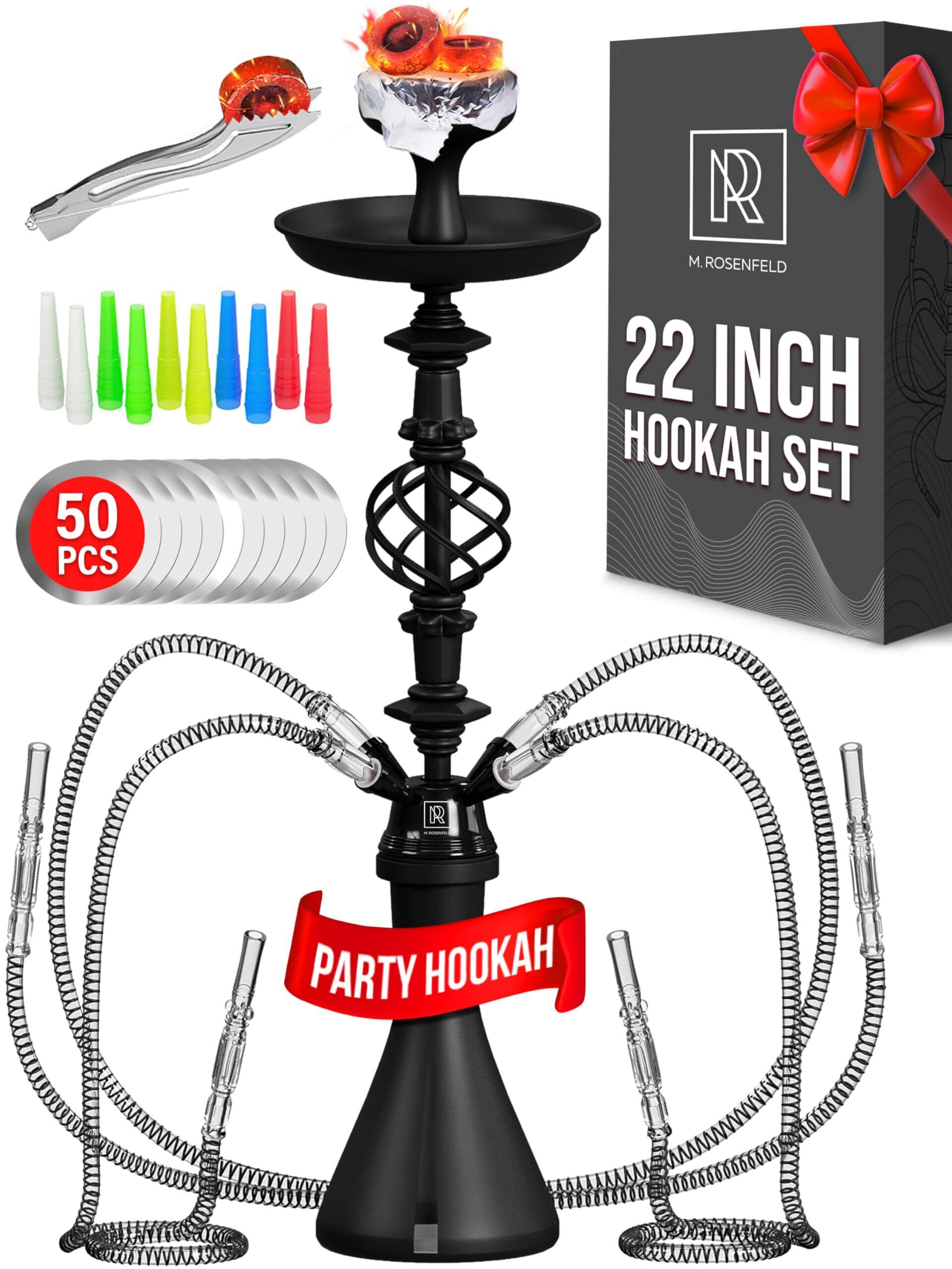 シーシャ 本体 55cm 4ホース シーシャ セット 一式 アウトドア 大型シリコンボウル・ホイル50枚・マウスピース10本・トング付 シーシャ 初心者セット 軽量アルミ軸のシーシャ 本体セット hookah set 倒れにくい安定ベース 初心者から上級者まで満足 メンテ簡単 プレゼント最適 M.ROSENFELD ブラック | kki