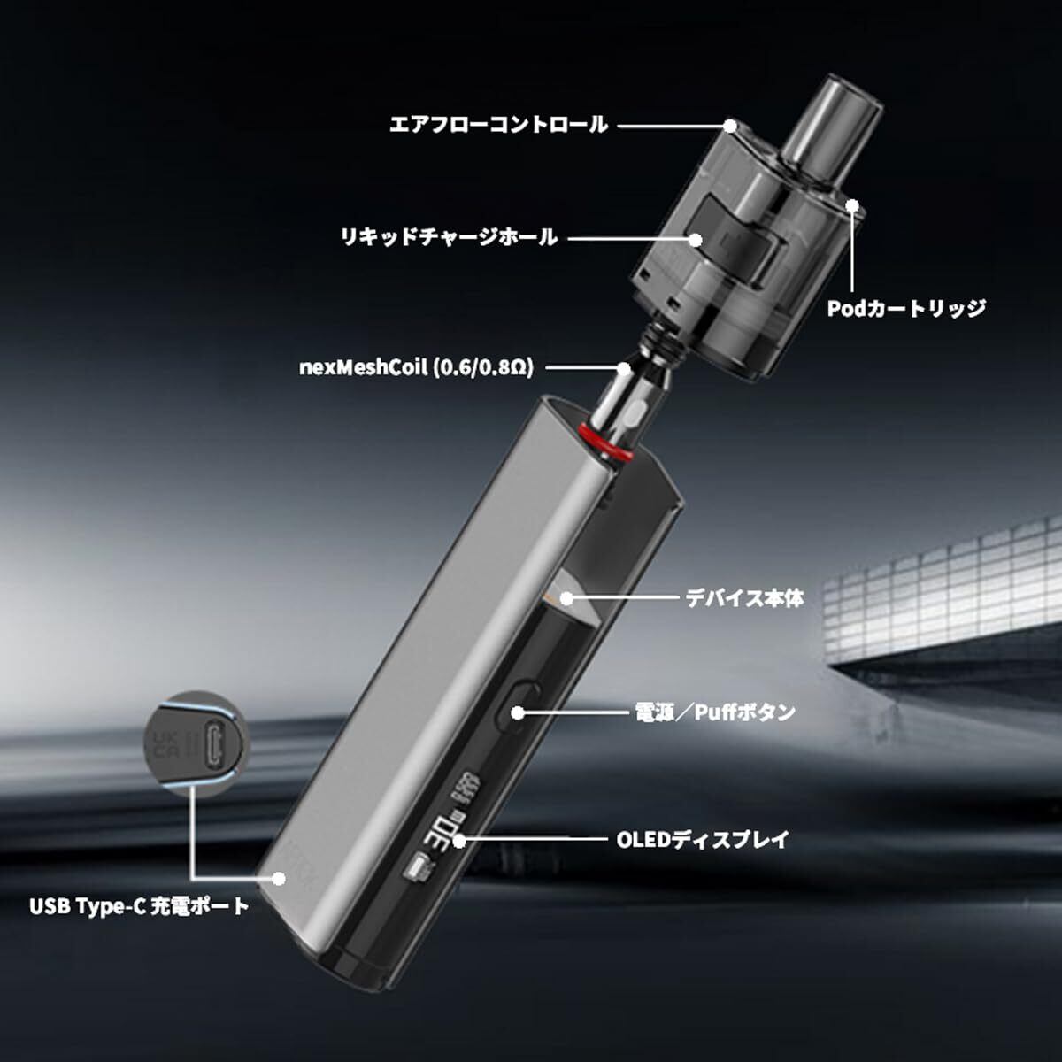 セット内容:デバイス本体 x1/0.6Ωコイル付きpodカートリッジ x1/0.8Ωコイル付きpodカートリッジ x1/USB Type-Cケーブル x1/ユーザーマニュアル