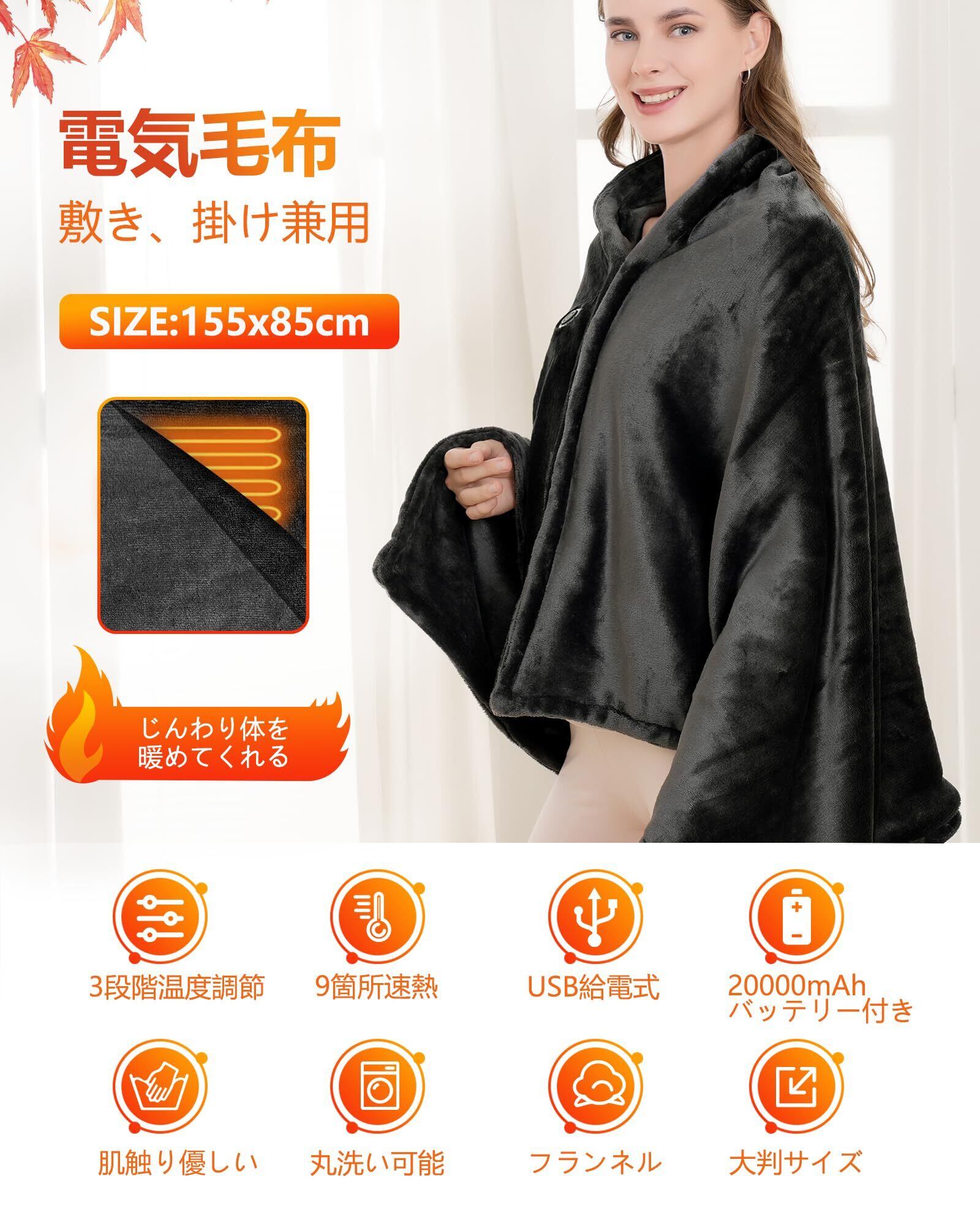 電気毛布 掛け敷き兼用 ひざ掛け毛布 9枚加熱エリア 20000mAh大容量バッテリー付き 150x80cm大判サイズ USB給電 最大13時間使用可能 日本製ヒーター採用 速暖 電気ブランケット 肩掛け 膝掛け 電気ひざ掛け 3段階温度調節 暖かい フランネル素材 丸洗い 省エネ 暖房器具 キャンプ 車中泊 テント泊 オフィス アウトドア 防寒対策 冬の贈り物に最適 男女兼用(グレー) | kki