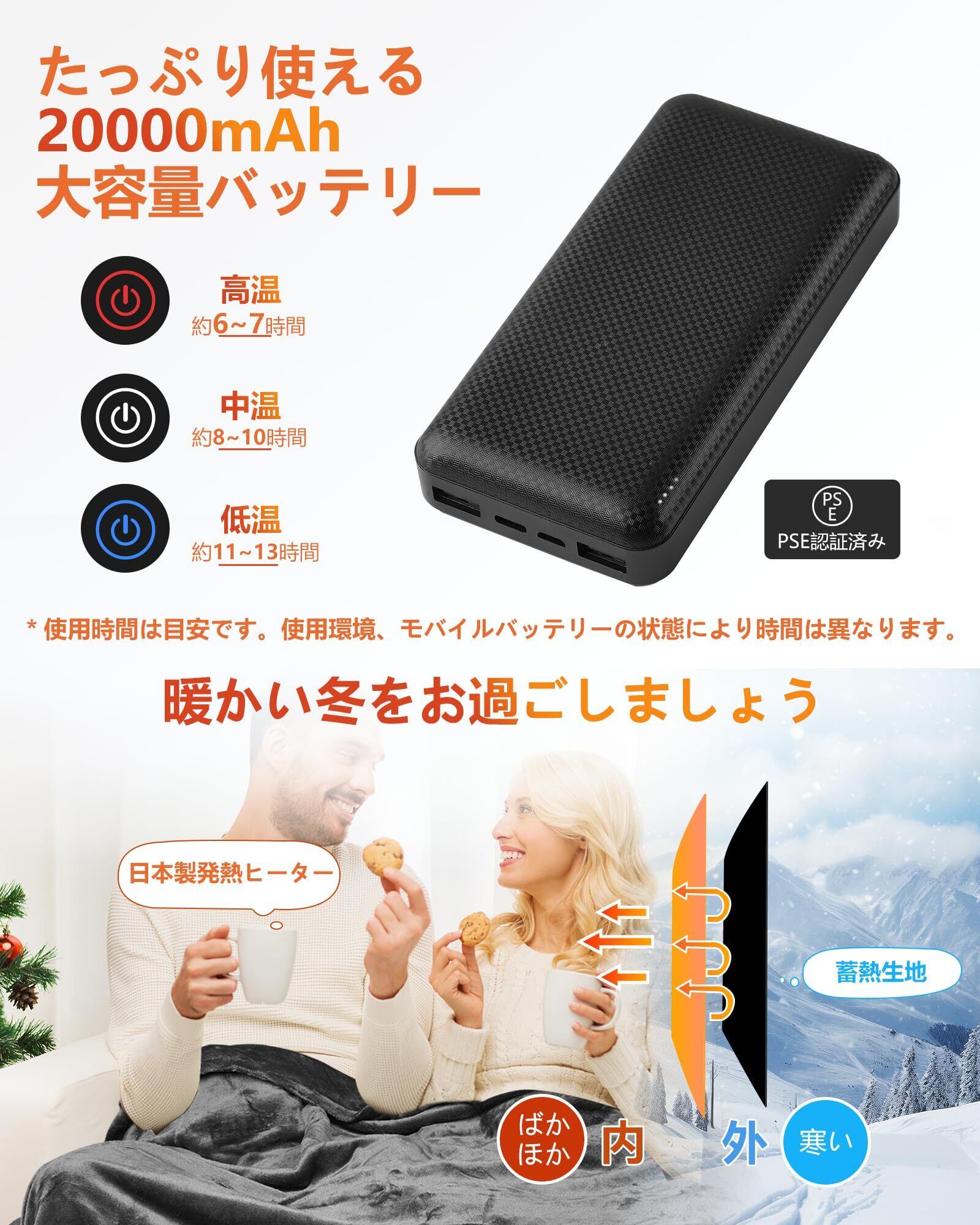 【20000mAhバッテリー同梱&長時間連続使用可能】20000mAh大容量バッテリー付で、届いてすぐに使用できます。バッテリーをフル充電すると、最大13時間の使用が可能です。また、バッテリーは軽量・コンパクトでポケットに収納しやすいし、持ち運びにも負担になりません。電源スポットに縛られないので、身につけたままの移動や持ち運びが可能なUSB給電式電気ブランケットです。USB電源で稼働できるので、非常時の防寒保温グッズとしても大変役立ちます。