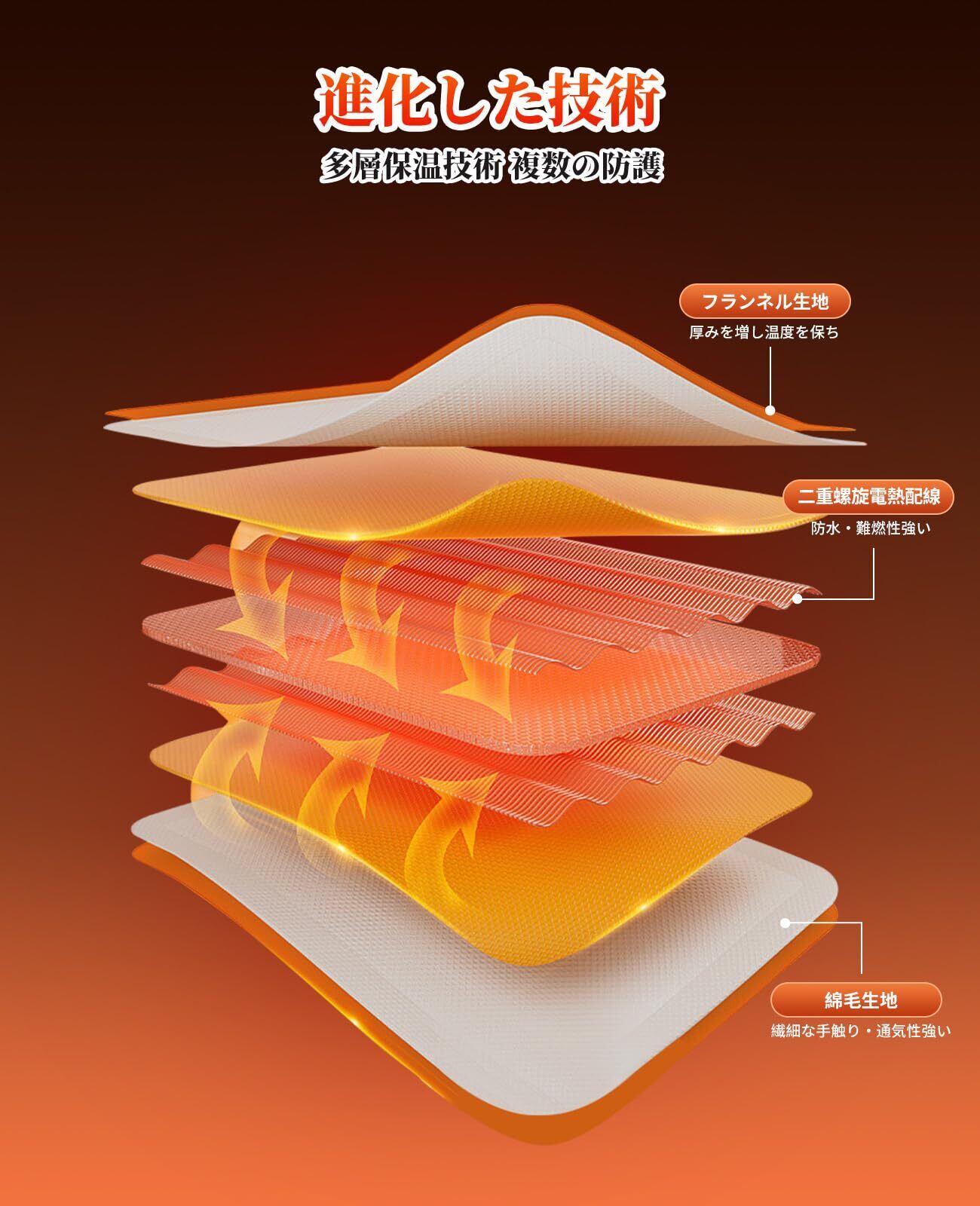 【進化したコントローラー&速暖&恒温&節電省エネ】この電気ブランケットはより高性能の2025新型のコントローラーを採用しております。電気ブランケットに通電して30秒以内には暖房効果を明らかに感じることができます。作動中は主に足元に暖房効果を提供し、頭部は比較的冷たく保つことで、体温のバランスをいつも保ちます。ご使用中に一番快適な温度を保つことができるように、周囲の温度に影響されずに電気毛布が設定された温度を維持する恒温機能も付きます。恒温節電のコントローラーで加熱時に必要な電力を最小限に抑えて電力消費をよく削減し、それでエアコンやヒーターの使用が必要なくなって長期的なエネルギーをよく節約できて冬季の高い電気代にお困りなくなります。