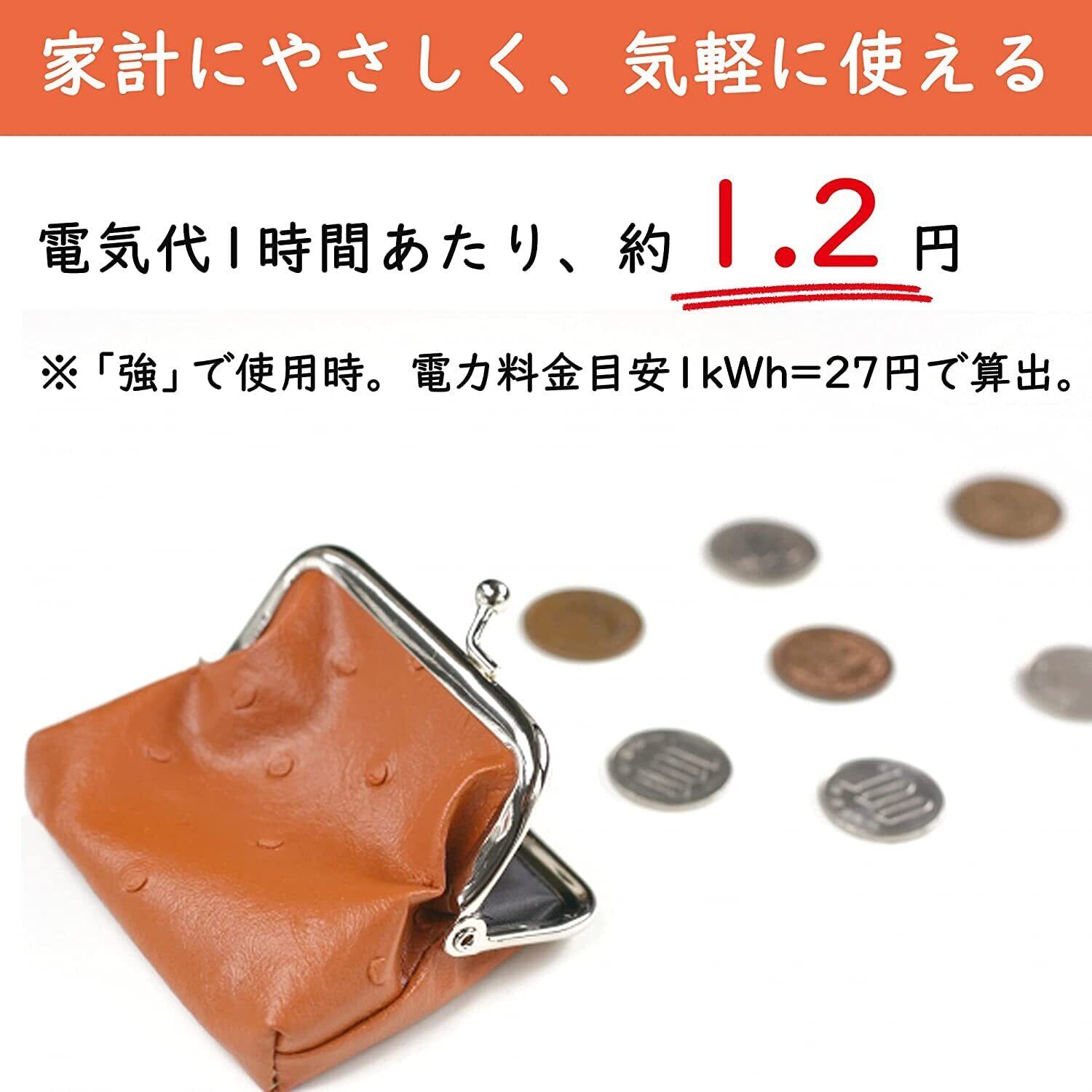 消費電力:60W、電気代目安(1時間あたり):弱=約0.4円/適温=約0.6円/強=約1.2円(1kW/h当り27円として計算)、表面温度(目安):弱=約23度/適温=約33度/強=約53度