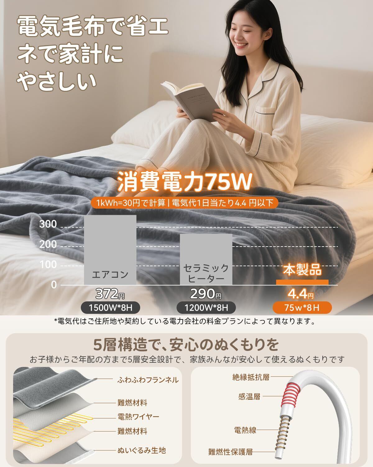 【操作しやすいコントローラー&5つタイマー&6つ温度モード&四重安全保護】電気ブランケットは従来品の3段階から大幅進化!「1(微温)~6(しっかり温め)」まで細かく調節可能、冷え性の方から暑がりな方まで、家族みんなの好みに合わせられます。2/4/6/8/10時間から選べる自動オフ機能を搭載し、「つけっぱなしで朝まで...」という心配なし!電気代の節約にも最適です。操作しやすいコントローラーは大きなボタンと明るい表示で、お年寄りでも迷わず操作できます。その上に、過電圧保護、過電流保護、短絡保護、過熱保護などもしっかり設定されますので、PSE認識済みで日常の使用はご安心ください。寒い季節に冷たくなった体や布団を温め、心地良い眠りをサポートします!「母の日に」「父の日に」「クリスマスの日に」「歳暮へ」プレゼントにも最適!
