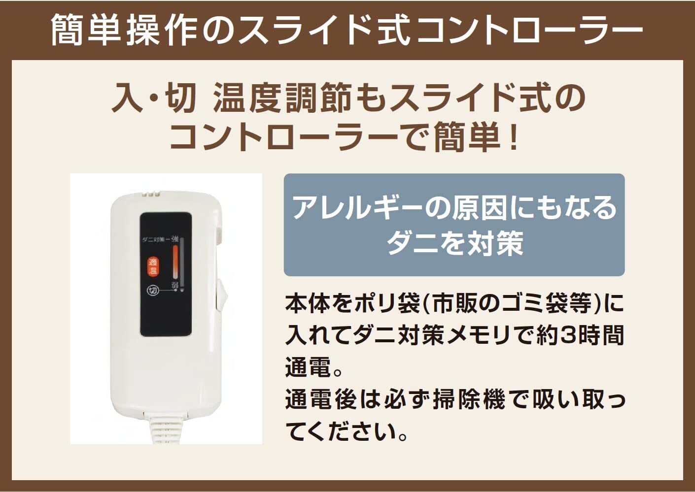 【手洗い&ダニ対策ができる】 清潔さを保つために、丸洗いとダニ対策機能付きの電気敷毛布。 指定の手順に従い約3時間通電することで、ダニ対策ができます。いつでも清潔な状態でお使いいただけます。