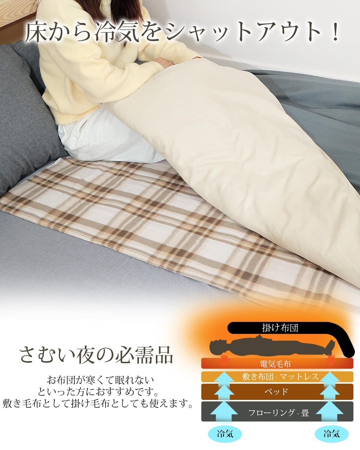 【寒い冬場の就寝時も快適に】この電気毛布敷きは寒い季節に冷えたベッド・ふとんや身体をぽかぽかにあたため、心地よい眠りに導いてくれる電気毛布。フローリングや畳からの底冷えもしっかりシャットアウトします。ひざに掛けても、肩からかけてもゆったり使える厚手生地な電気ひざ掛け。