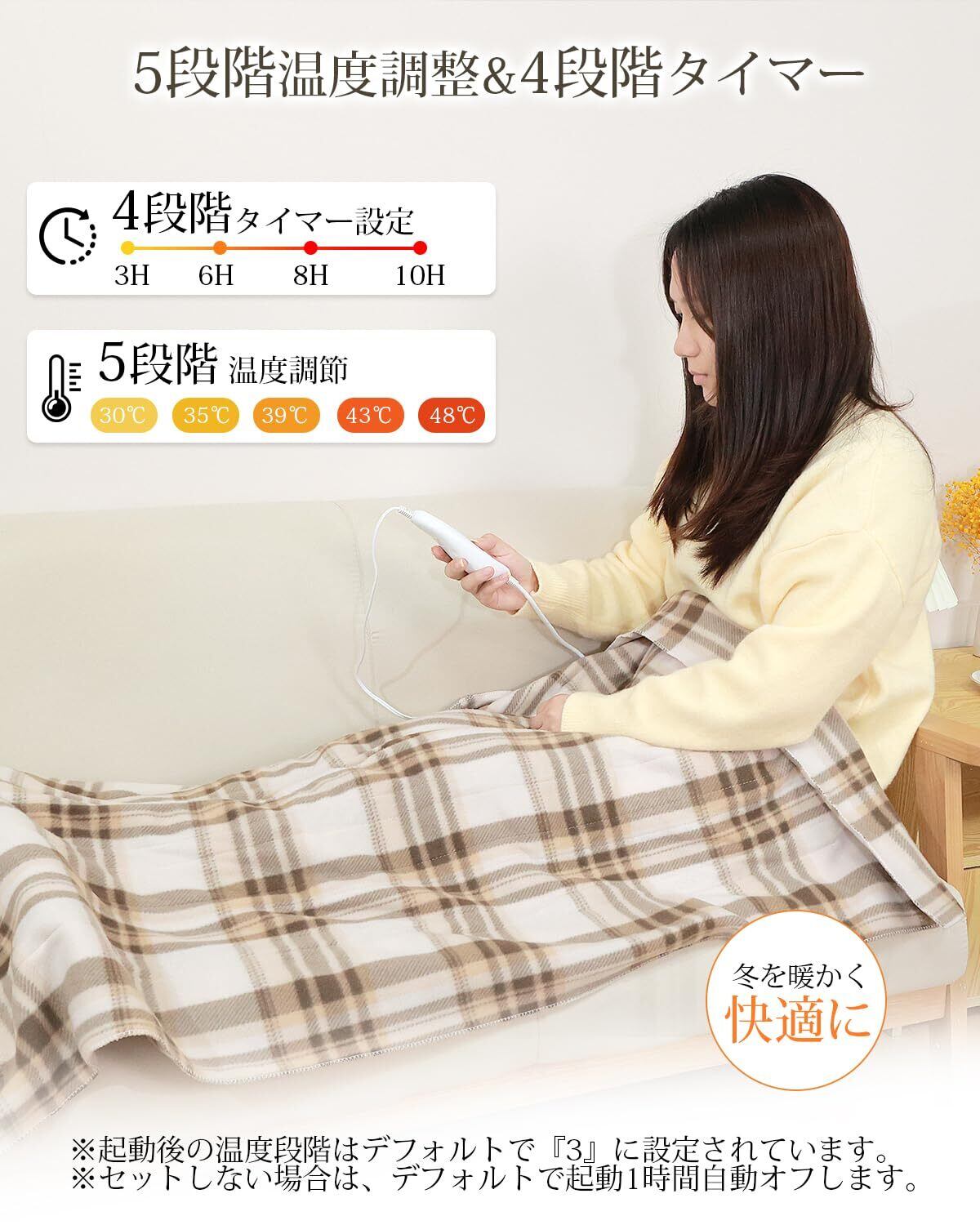 【5段階温度調整・切り忘れ防止タイマー付き】電気毛布はボタンを押すだけの簡単操作で、温度とタイマーの時間を細かく設定することができる。コントローラーを備え、ボタンを押すだけで温度を(30、35、39、43、48℃)5段階の範囲で調節できます。また、この電気毛布敷きはタイマー機能が搭載され、3、6、8、10時間をご自由に選択できます。外出の時、電源を消したかの不安は必要ない。