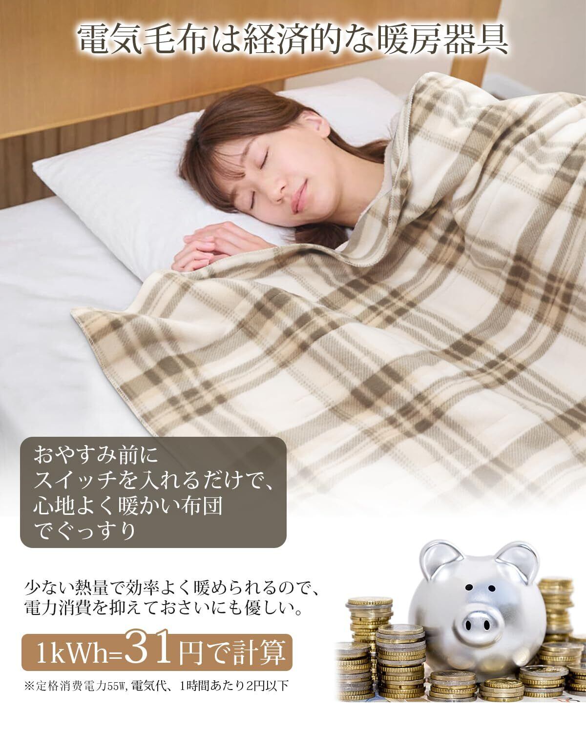 【電気代がとってもお得・足元ポカポカ設計】電気毛布は経済的な暖房器具です。最大消費電力55Wで、他の暖房器具より電気代を抑えられます。断熱性の高い布団を使うと、より温かくなり電気代の節約にもなります。こちらの電気毛布は配線を工夫し足元を重点的に暖める足元ポカポカ設計、頭寒足熱配線となっております。腰回りから足元までが冷えてなかなか眠れない方におすすめの電気毛布です。フローリングや畳からの底冷えもしっかりシャットアウトします。