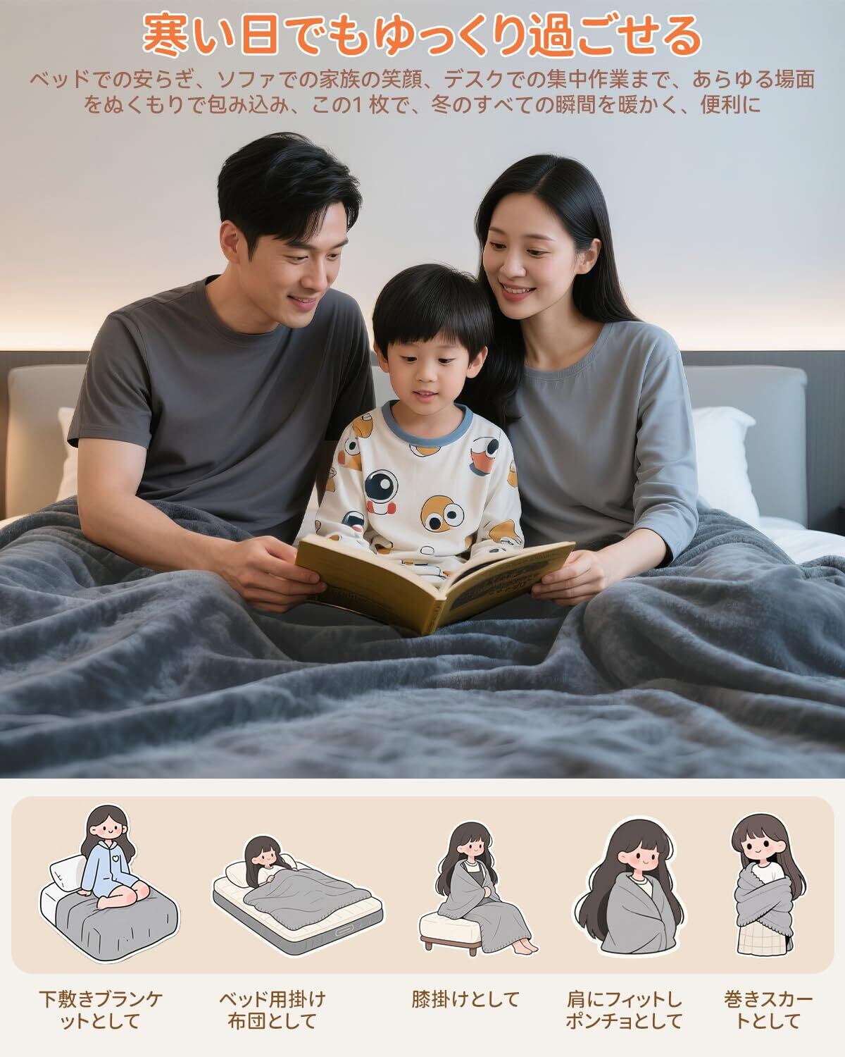 【ダブルサイズ200×140cm&掛け敷き兼用】電気毛布本体のサイズが200×140cmであり、ダブルサイズで掛け敷き兼用、ひざ掛けとしても肩掛けとしても快適に使用できて、寒い日でもゆっくり過ごせます。高身長のユーザーも全身を完全にカバーできるこの200*140cm の大きな電気毛布は、ベッドやソファの上でも十分に覆うことができ、単独で使用する場合や複数人で共有する場合でも、全身を均一に暖めることができます。寒い冬の夜でも足元までしっかりと暖かく保つことができ、夫婦や子供がいる家庭では、一緒にベッドで眠ったり、ソファで休んだり、家族全員が同時に暖かさを享受でき、家庭の幸福感を高めることができます。ベッドでの安らぎ、ソファでの家族の笑顔、デスクでの集中作業まで、あらゆる場面をぬくもりで包み込みます。この1 枚で、くるっと巻いて、さっと掛けて、ポンと置いて、冬のすべての瞬間を暖かくしましょう。