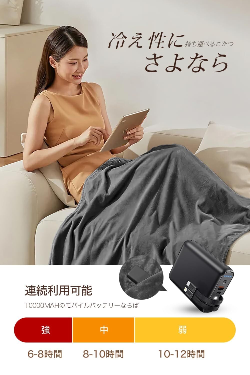 【使い方色々】肩掛け用のフックも付いており、肩、腰、お腹、もも、膝、足など全身のあたために使用できます。自宅のソファー、部屋のベッド、オフィスの椅子、車内、テント内などに適用。【パッケージ内容】毛布本体(ヒーター部&コード付き、毛布内部に収納)、モバイルバッテリー、取扱説明書(書付き)。【一年安心付き】万が一商品に不具合がある場合は、商品ページの販売元店舗をクリックして、「質問する」ボタンより店舗までご連絡いただければ迅速に対応いたします。