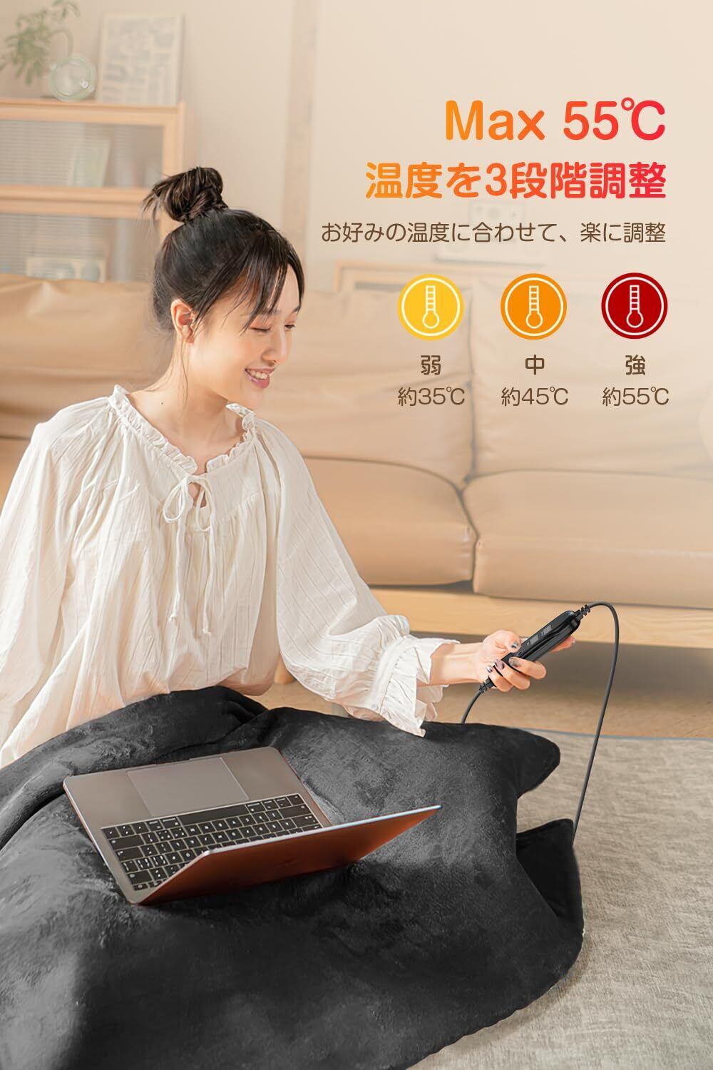 【掛け敷き兼用 USBブランケット】USB給電式で、バッテリーに繋ぎながら使う電気ブランケットです。100×74cmの大判サイズで、着て、羽織って、膝にかけて、腰に巻いて、足にかけて、色々使え、内蔵されたヒーターによりじんわりと温めてくれて、手軽に底冷え対策可能、寒がりな方におすすめ。防寒対策として、冬の寒さを乗り切るおともにぴったりで、冷房で体が冷える夏場の室内でも活用できます。