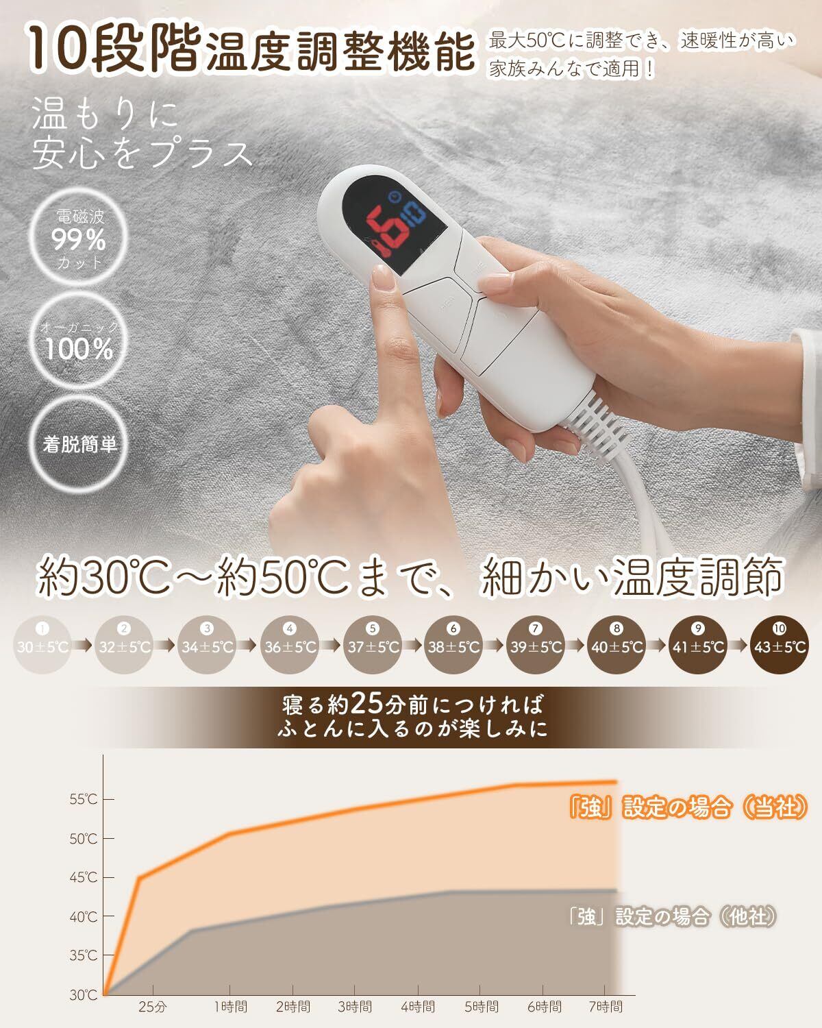 【10段階温度調節・切タイマー機能】好みに合わせて温度を調整できるので、自分の体温や周りの気温に合わせて、快適な温度に設定できます。