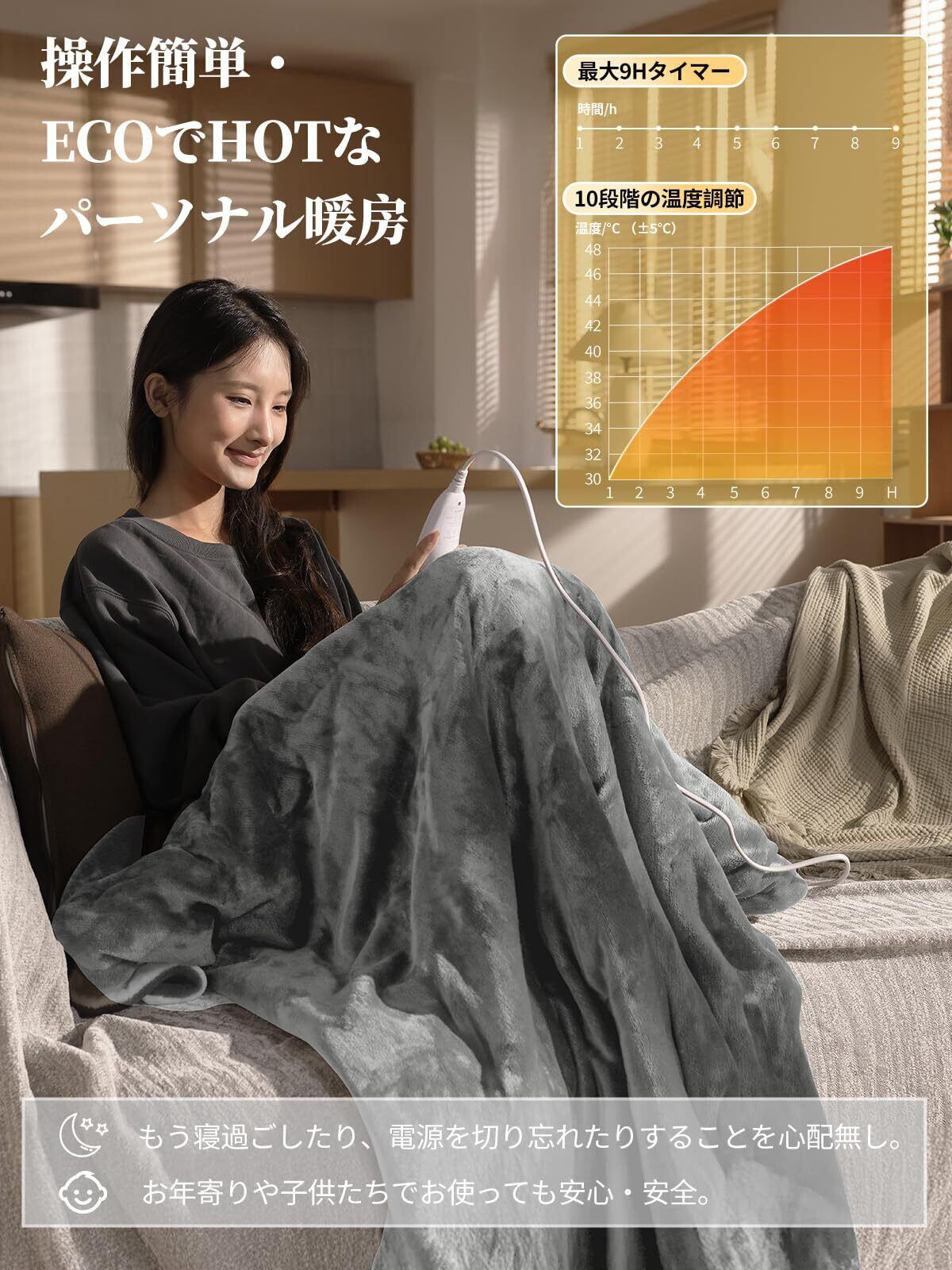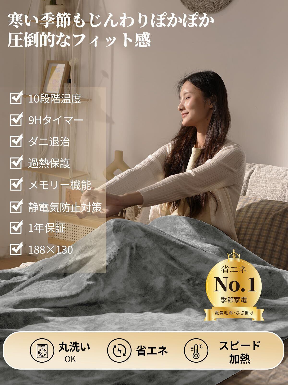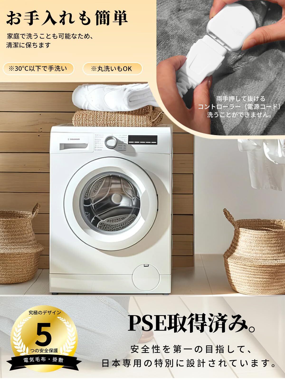 安全性へのこだわり・何よりも安全性を第一に。①電気毛布部分は洗たく機で丸洗える可能、清潔さを保つのが簡単。②抗菌防臭加工を施し、高温設定時にはダニ退治も可能で清潔感にこだわる方にも最適。③タイマーは自動OFFが基本。消し忘れの心配がなく、デフォルト3Hで使用と節電にも安心。④PTCパッシブ温度制御、過圧保護、阻燃保護、均一加熱により安心して心地よい睡眠をサポート。⑤電気ひざ掛けは静電気防止対策を強化。パチパチしない使い心地で、冬の快適さをアップ、寒い冬の重宝。⑥PSE認証取得済み。