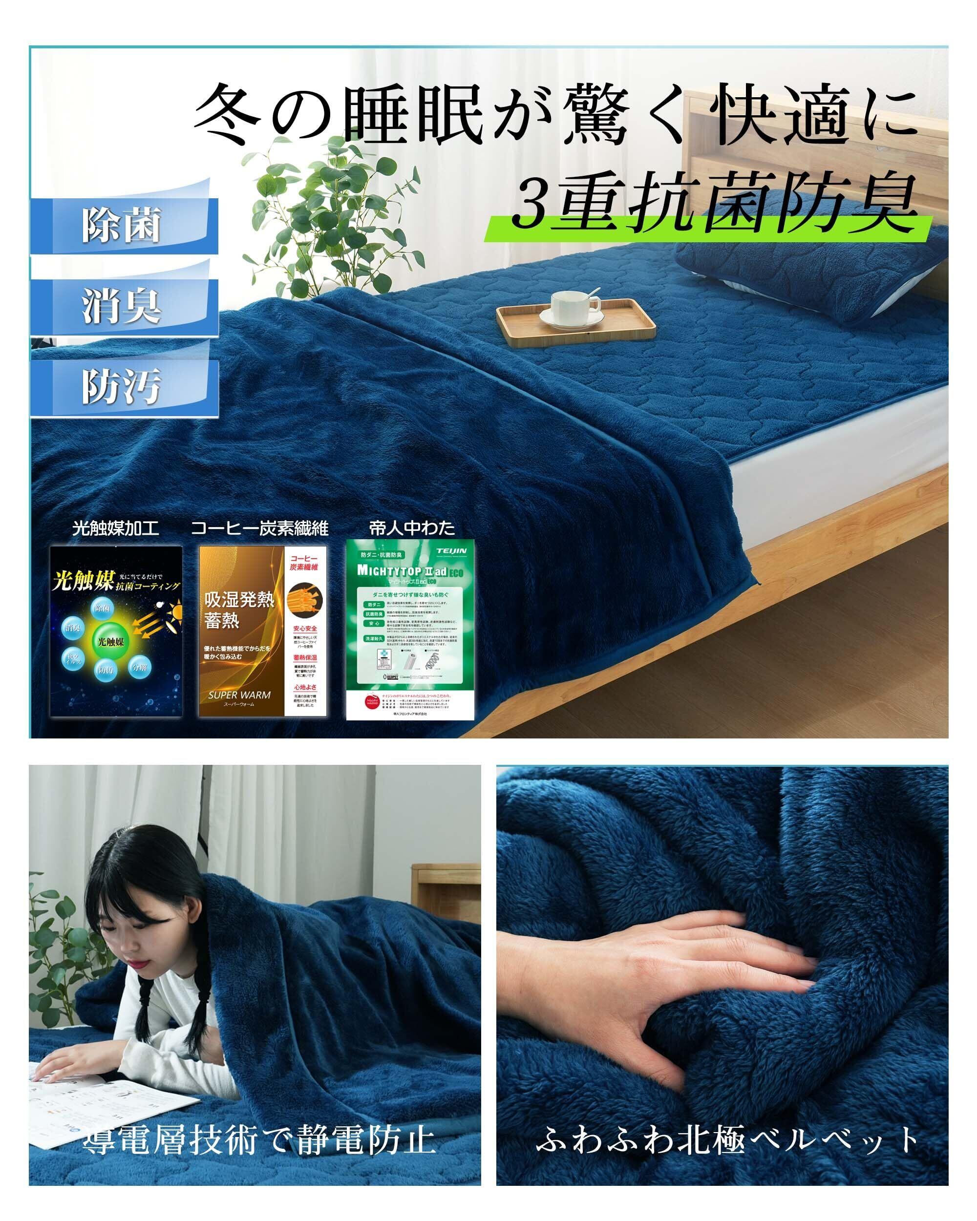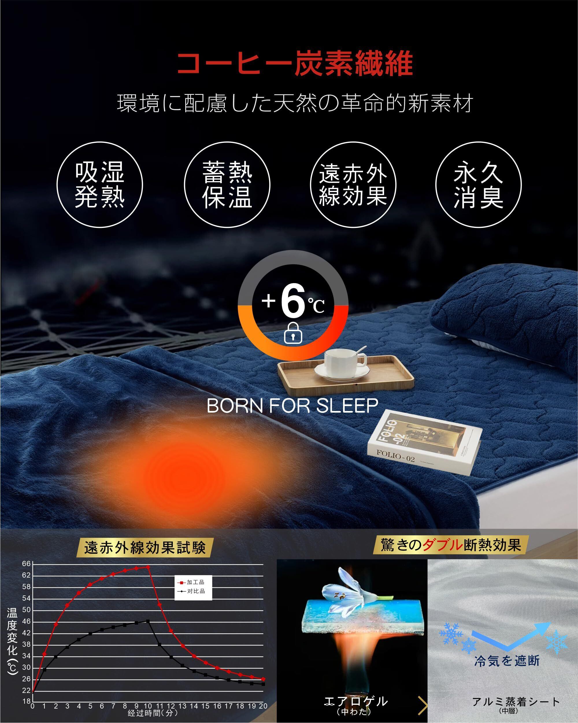 『アルミ蒸着シートを含む6重保温』研究に研究を重ね、こだわりぬいた独自の6重特殊構造により、暖房いらずで朝までポカポカの2枚合わせ毛布/厚手毛布。表層と裏層にも触り心地がふわふわの温熱北極絨生地を使用。 中層には「冷気遮断」機能を持つアルミコーティングされた熱反射層、「断熱」エアロゲルわた、「遠赤外発熱」コーヒー炭素わた、「抗菌防臭」帝人TEIJINマイティトップⅡECO 中綿を採用。包まれるようなあたたかさで"至福の眠り"を提供する、贅沢な構造とやさしい温熱効果です。