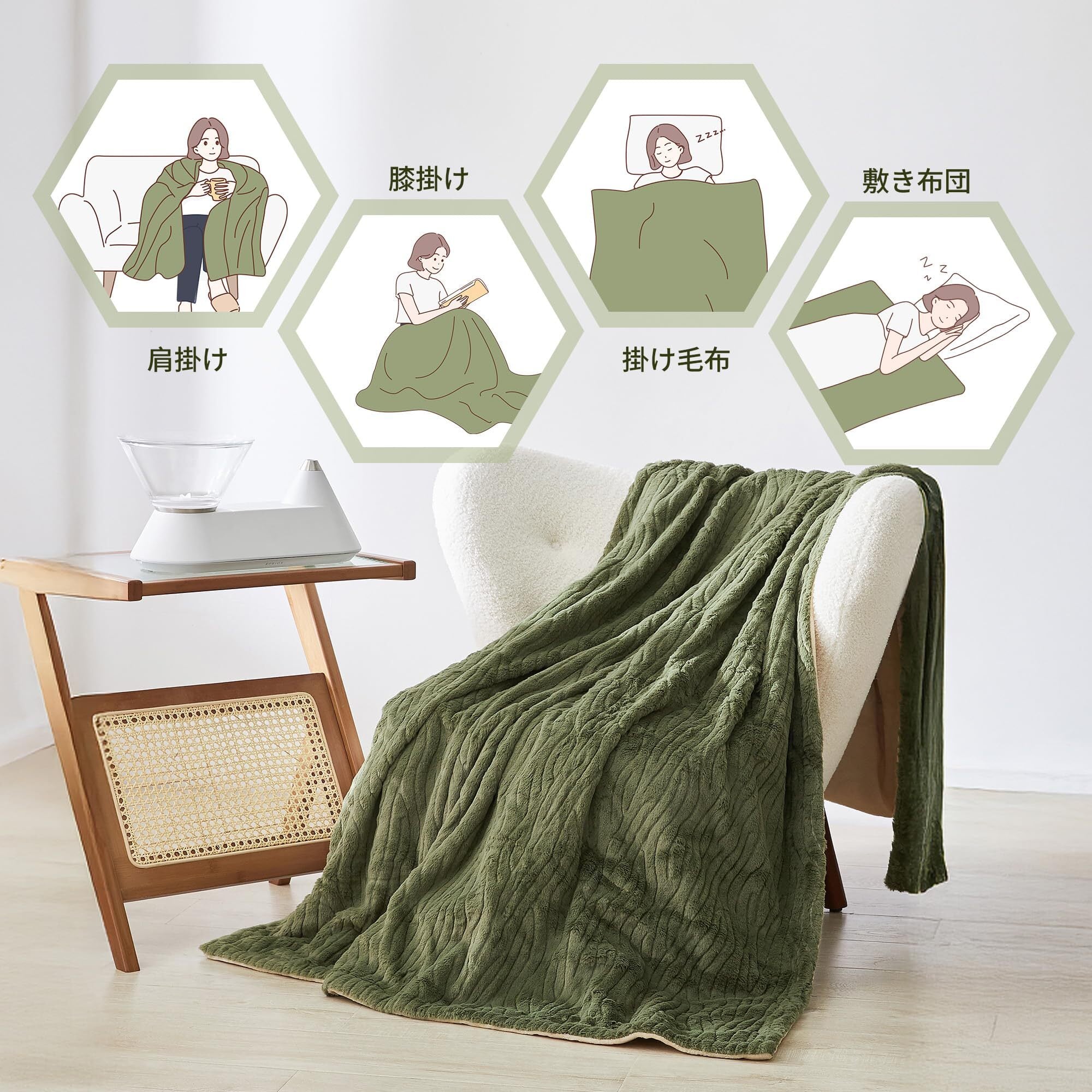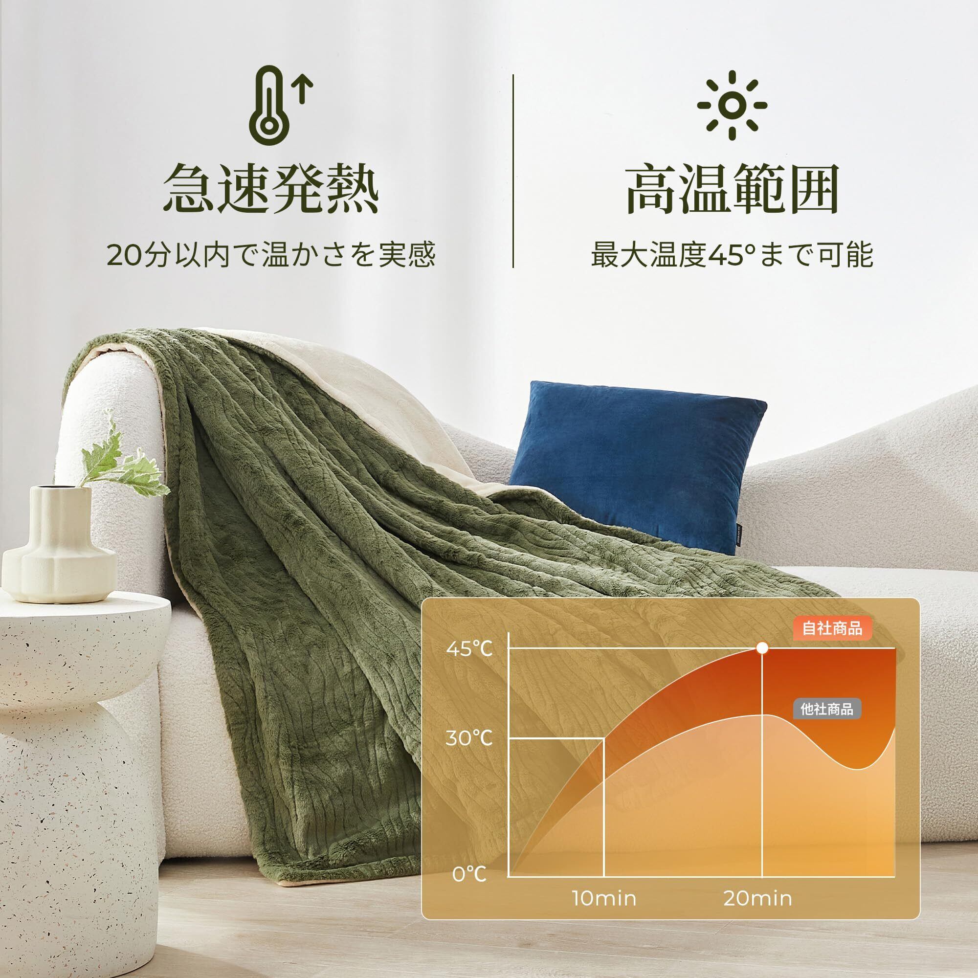 【掛敷兼用・幅広い活用方法】大判サイズ:188x130cm。電気敷き毛布と電気掛け毛布兼用可能。リラックス時にソファに掛けて温まったり、デスク作業時にピンポイントで体を温めたりと、1枚の電気カーペットで寒い冬の日には暖かさを提供します。