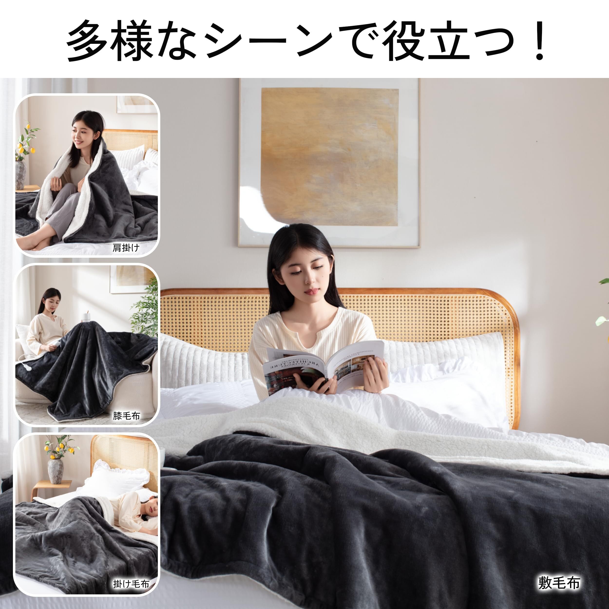 【両面異素材で極上の肌触りと保温性✙190×130cm大判サイズ】表面にはなめらかなフランネル、裏面にはふんわり柔らかなシープボアを使用し、触れた瞬間に心地よいぬくもりを感じられます。190×130cmの大判サイズは肩から足元までしっかりカバーし、ベッドでの使用はもちろん、ソファでのリラックスタイムや床に座る時のひざ掛けとしても大活躍。冬の寒さから体を守りながら、贅沢な暖かさをお届けします。※ご注意:毛布の中央部には加熱線を固定するための縫い留め点が4か所があります。非常に小さく目立たない仕様であり、不良品ではなく構造上必要なものとなります。