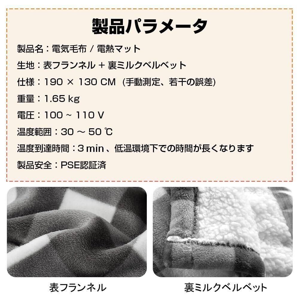 【 大きいサイズ·柔らかい素材】 電気毛布はチェック柄の外観デザインで、外側はフランネル+内側はミルクベルベットで作られており、柔らかく快適な手触りと優れた保温効果があります。190cm×130cmの大サイズで全身をすっぽりカバーでき、ショールやシーツ、掛け布団としても使え、寒い季節に冷えた体を温めて快適な睡眠をお届けします!