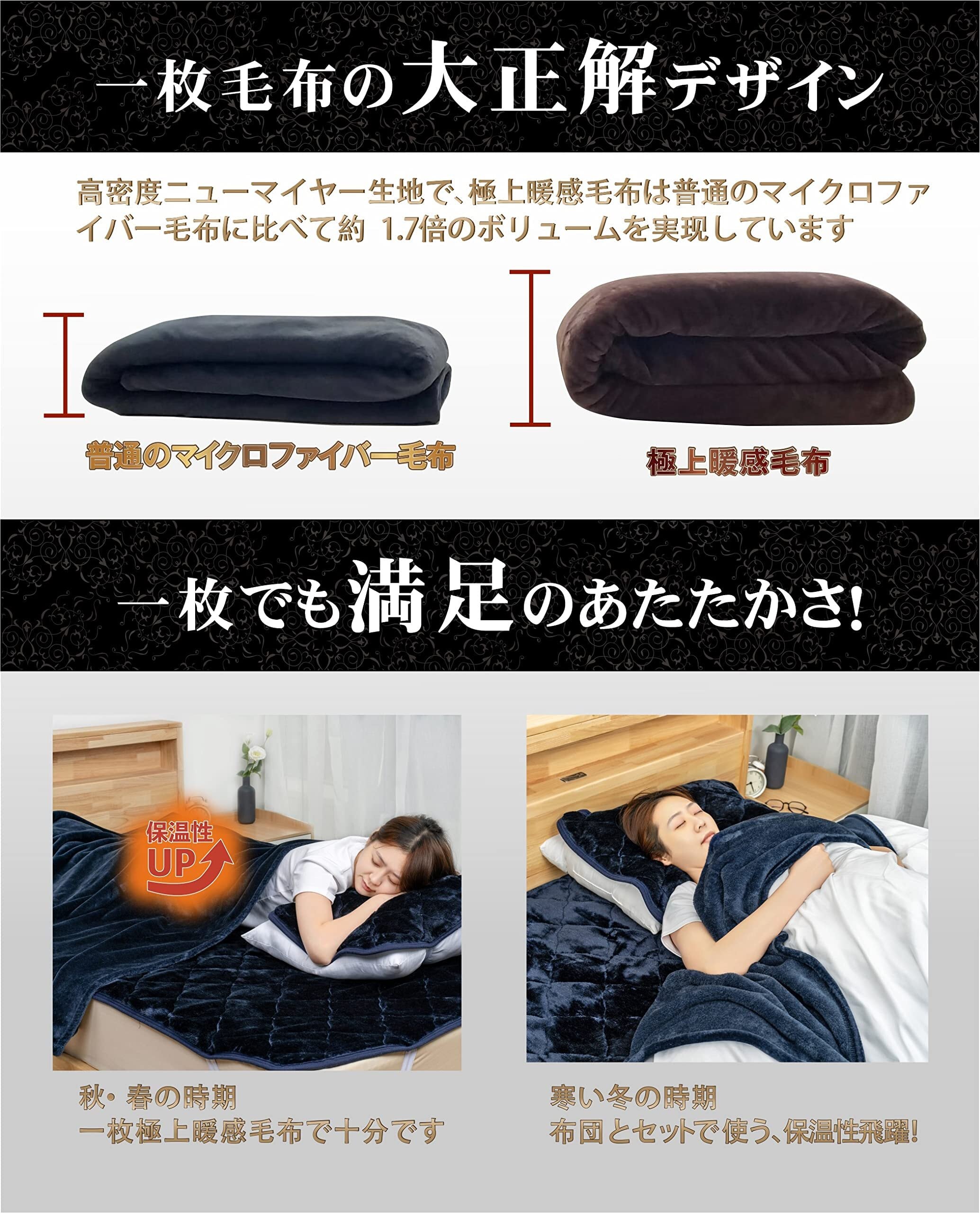〔日本伝統技法、極上の暖かさの毛布〕一般的に流通された2枚合わせの毛布と比べ、本製品は1枚の毛布に仕上げ、生地を両面共に起毛させたニューマイヤー毛布になります。毛足に空気を多く包み込んでいるため、暖かい空気をしっかりと閉じ込め、蓄熱保温性に優れているのが特徴です。さらに軽量でご使用時の圧迫感を感じにくく、快適にご使用いいただけます。