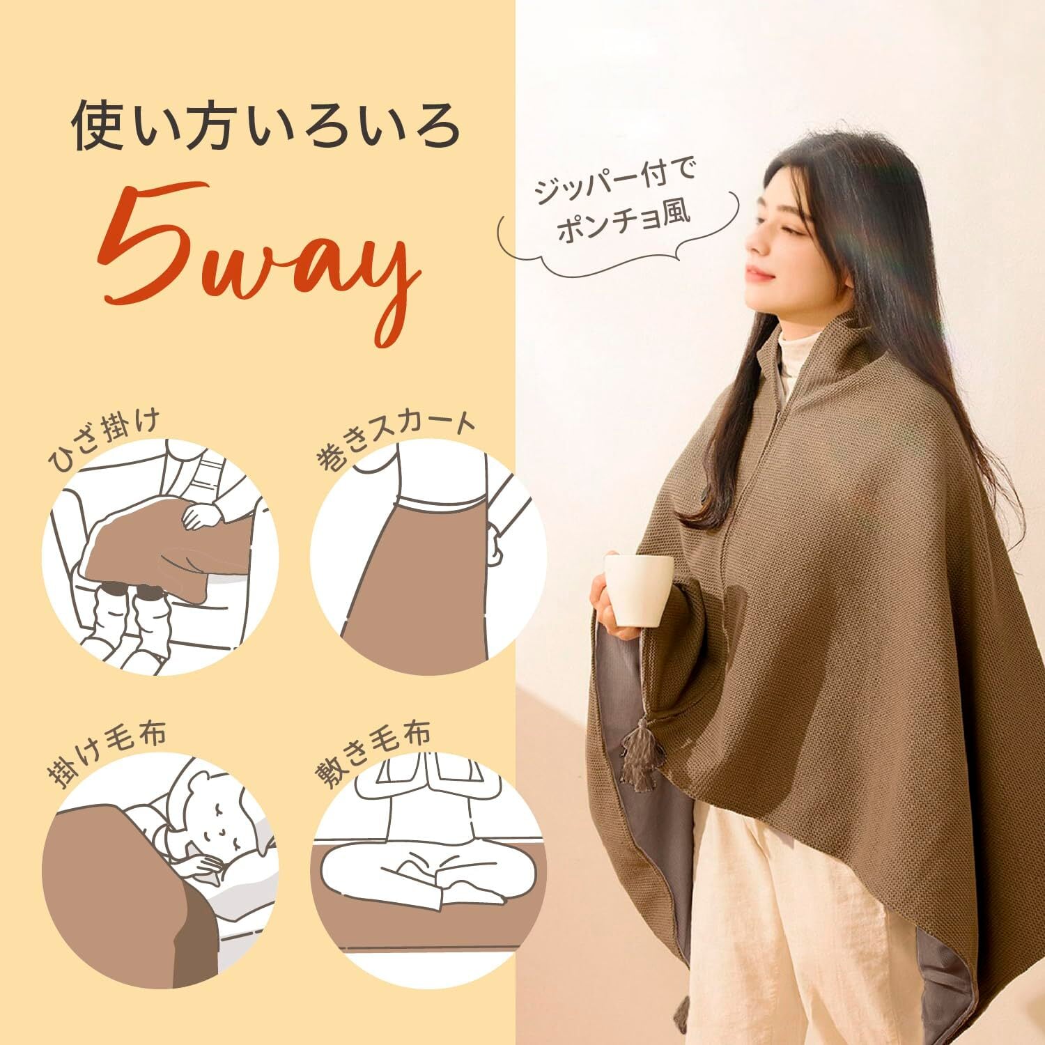 【ユニークなジッパーデザインで、ショール&ブランケットの2WAY使用】革新的なジッパーデザインにより、ジッパーを閉じれば肩や首元を温めるショールに、ジッパーを開ければ膝や腰を覆えるブランケットに早変わり。寒いオフィスや通勤中の防寒にも、自宅や旅行先でのリラックスタイムにも最適の着る電気毛布です