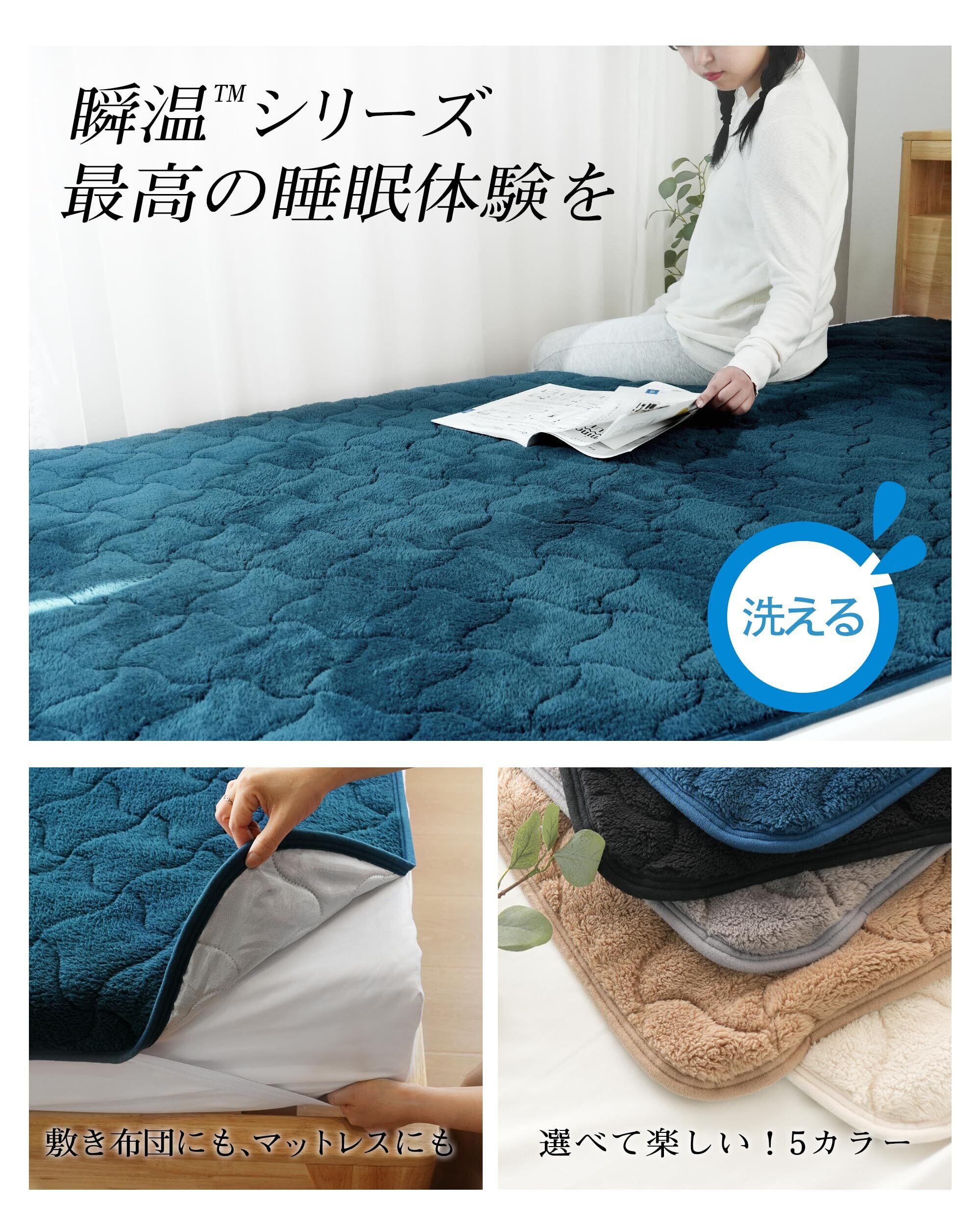 『W静電気防止+CICA加工で肌に優しい』生地には静電気防止加工に加えて、特殊な導電層技術を採用し、寒い季節に起こる静電気の不快感を大幅に緩和しました。韓国美容でも話題の、肌荒れを防ぐ天然由来成分のCICA加工により、しっとりなめらかな心地よい肌触りに仕上げました。真冬の冷たい外気の中でも、暖かい敷きパッドで優しく冷えた身体を包んでくれます。