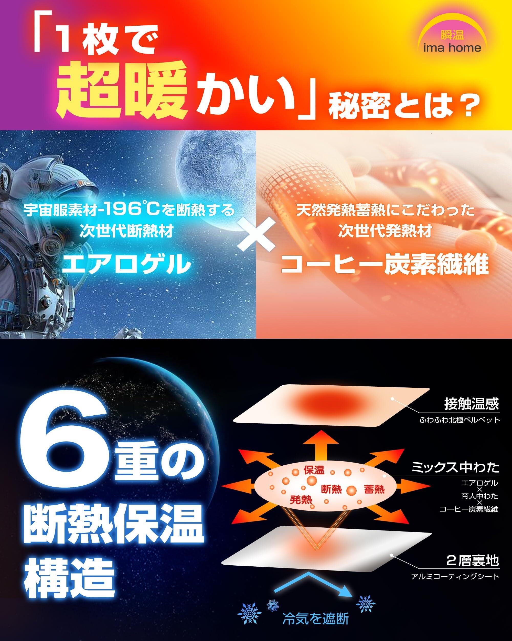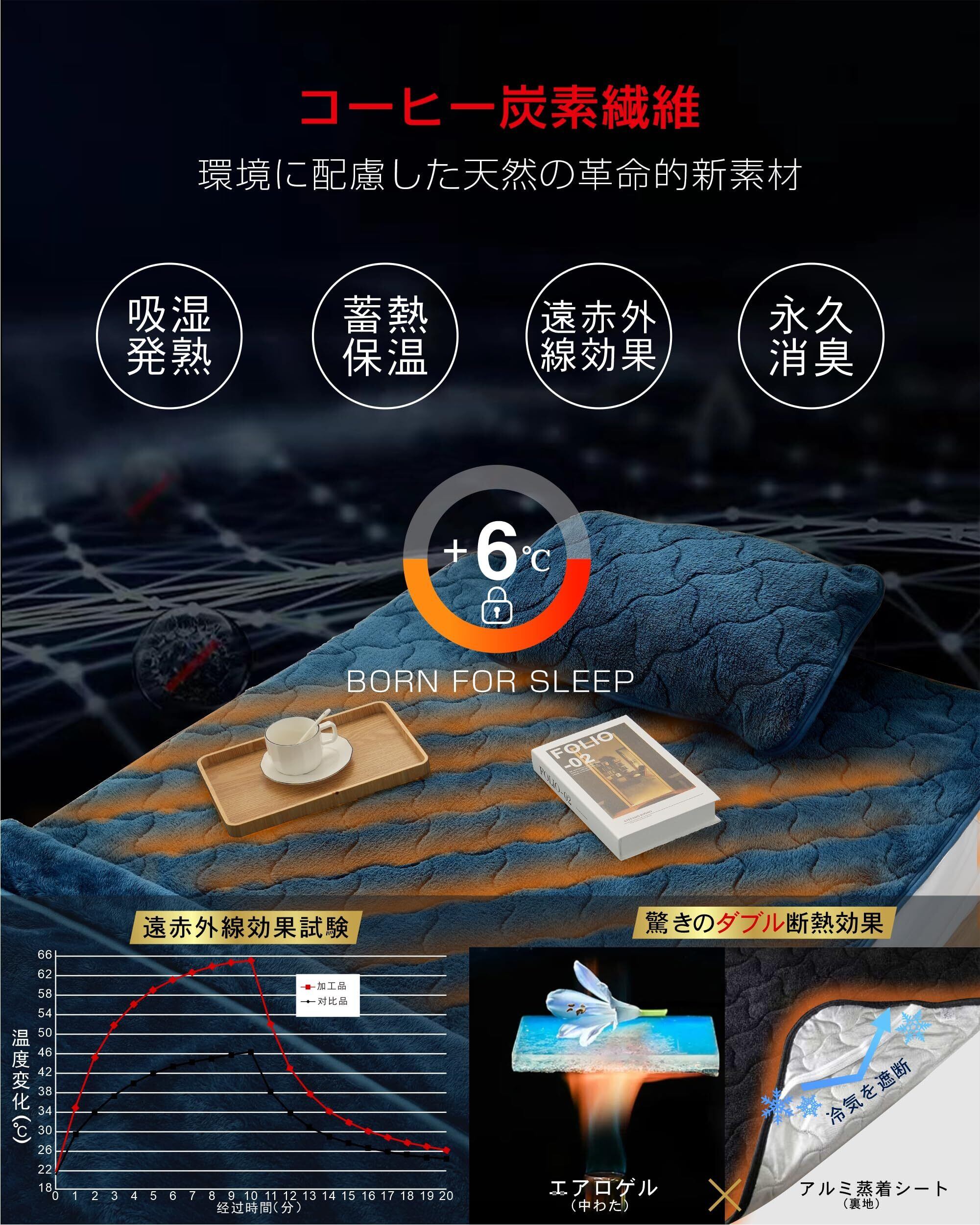 『2つの最先端テクノロジーで誕生、未来のあったか敷きパッド』「21世紀に革命を起こす素材」として知られる「エアロゲル」は、宇宙服にも使用されている圧倒的な「断熱性」「軽量性」「通気性」「柔軟性」「耐久性」を誇る素材です。また、「次世代の夢のような素材」と称されるコーヒーファイバーは、天然の「吸湿発熱」「蓄熱保温」「遠赤外発熱」「永久消臭」の特性を持ち、環境にもやさしい素材です。これら2つの最先端素材を冬用敷きパッドに使用し、究極の暖かさと快適さを実現しました。私たちにとっては小さな一歩かもしれませんが、寝具(敷きパッド)の世界にとっては大きな前進だと確信しています。ぜひ、"極みの一枚"を体験してみてください。