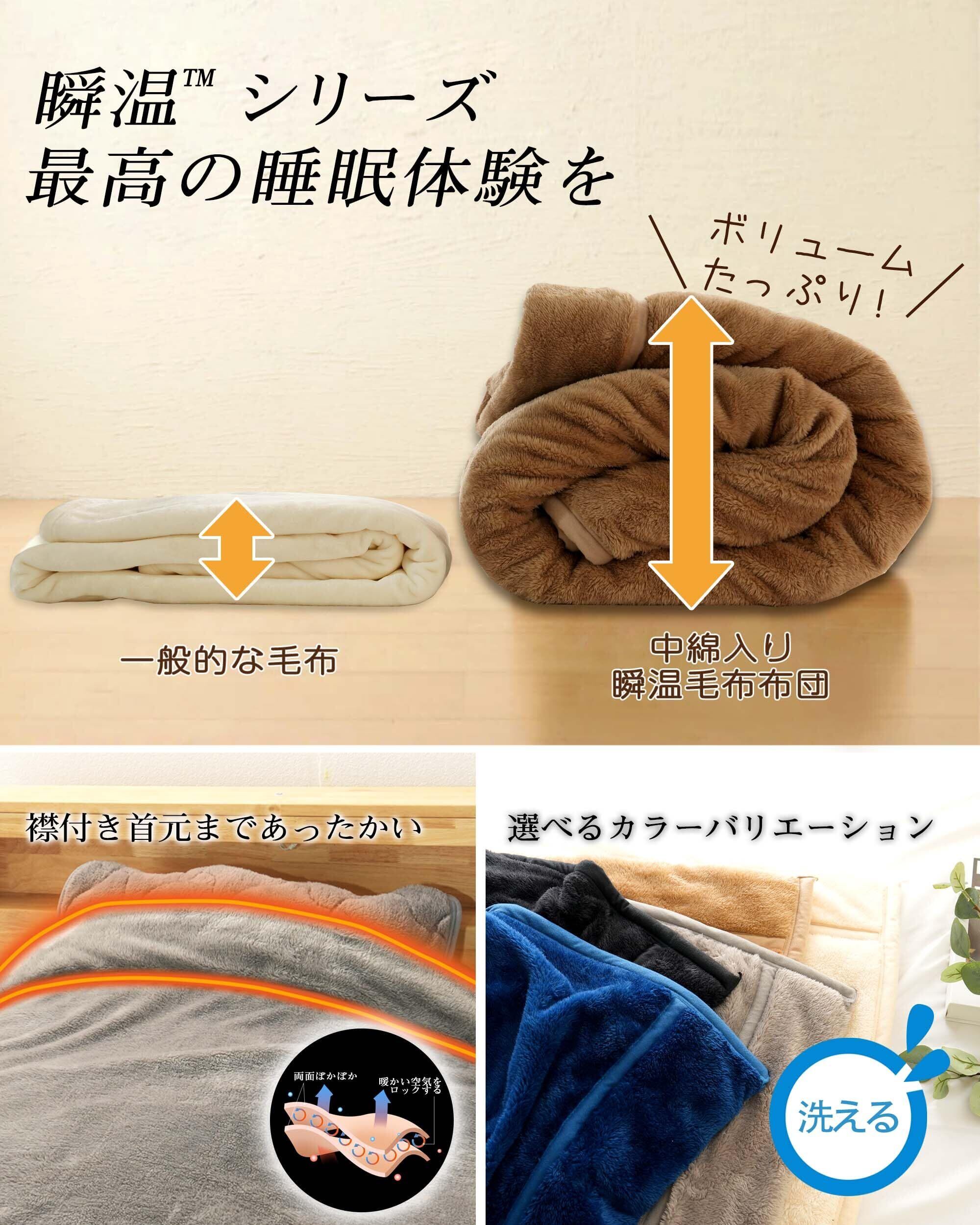 『アルミ蒸着シートを含む6重保温』研究に研究を重ね、こだわりぬいた独自の6重特殊構造により、暖房いらずで朝までポカポカの2枚合わせ毛布/厚手毛布。表層と裏層にも触り心地がふわふわの温熱北極絨生地を使用。 中層には「冷気遮断」機能を持つアルミコーティングされた熱反射層、「断熱」エアロゲルわた、「遠赤外発熱」コーヒー炭素わた、「抗菌防臭」帝人TEIJINマイティトップⅡECO 中綿を採用。包まれるようなあたたかさで"至福の眠り"を提供する、贅沢な構造とやさしい温熱効果です。