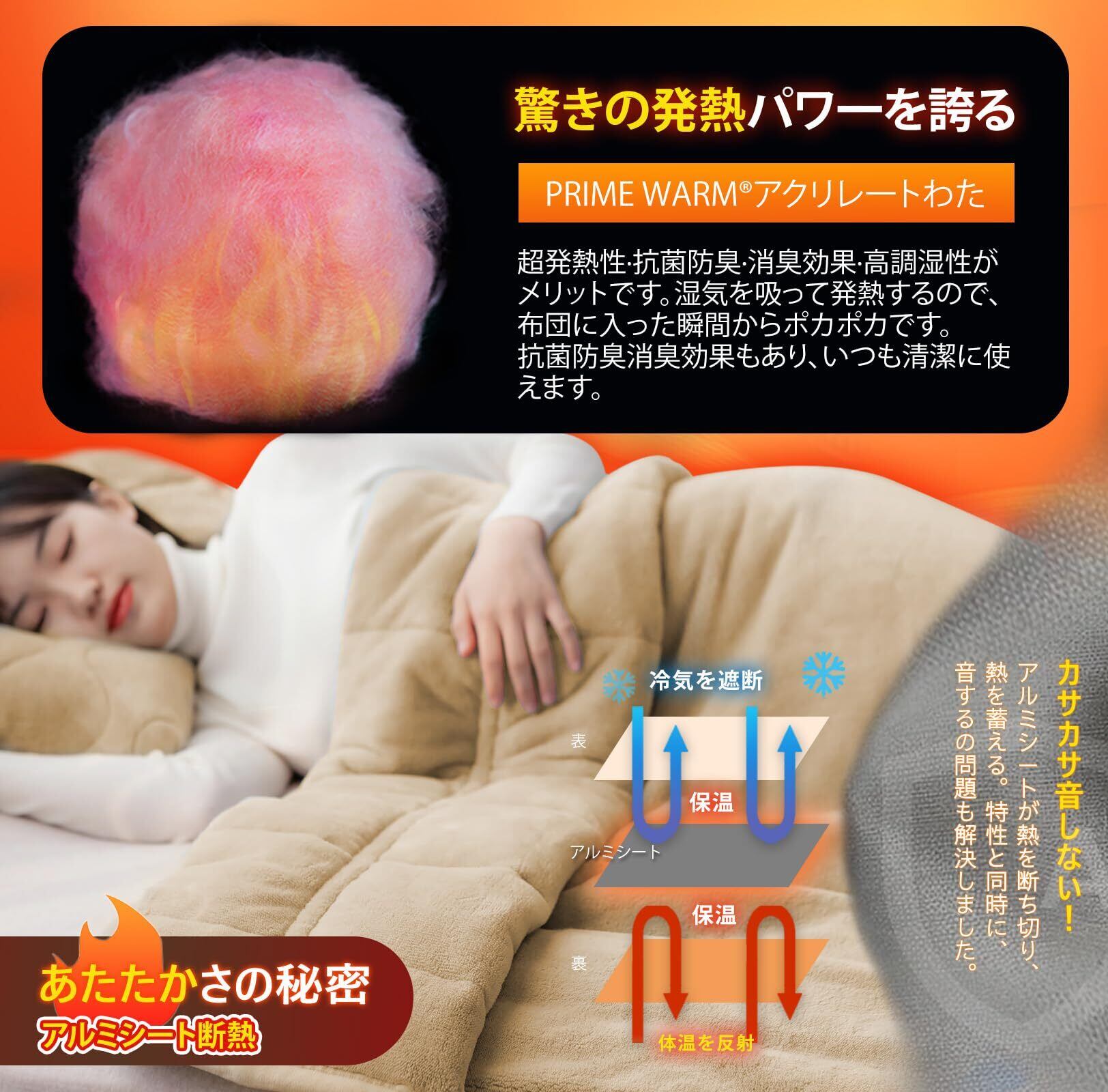 【真冬に絶対】電気代が上昇する今、暖かさ抜群の毛布は冬の快適な必需品です。のこの毛布布団は、アルミシートとエアロゲルシートを使い二重の断熱性に加え、蓄熱綿と吸湿発熱綿を組み合わせた二重の保温性を持っています。また、中綿には日本の有名な帝人の抗菌防臭繊維が含まれ、さらに表面生地には光触媒加工を施したフランネルを使用しており、温感フランネルを使用し、乾燥肌を防ぎながら、肌の修復をサポートし、静電気も抑えるよう工夫しています。