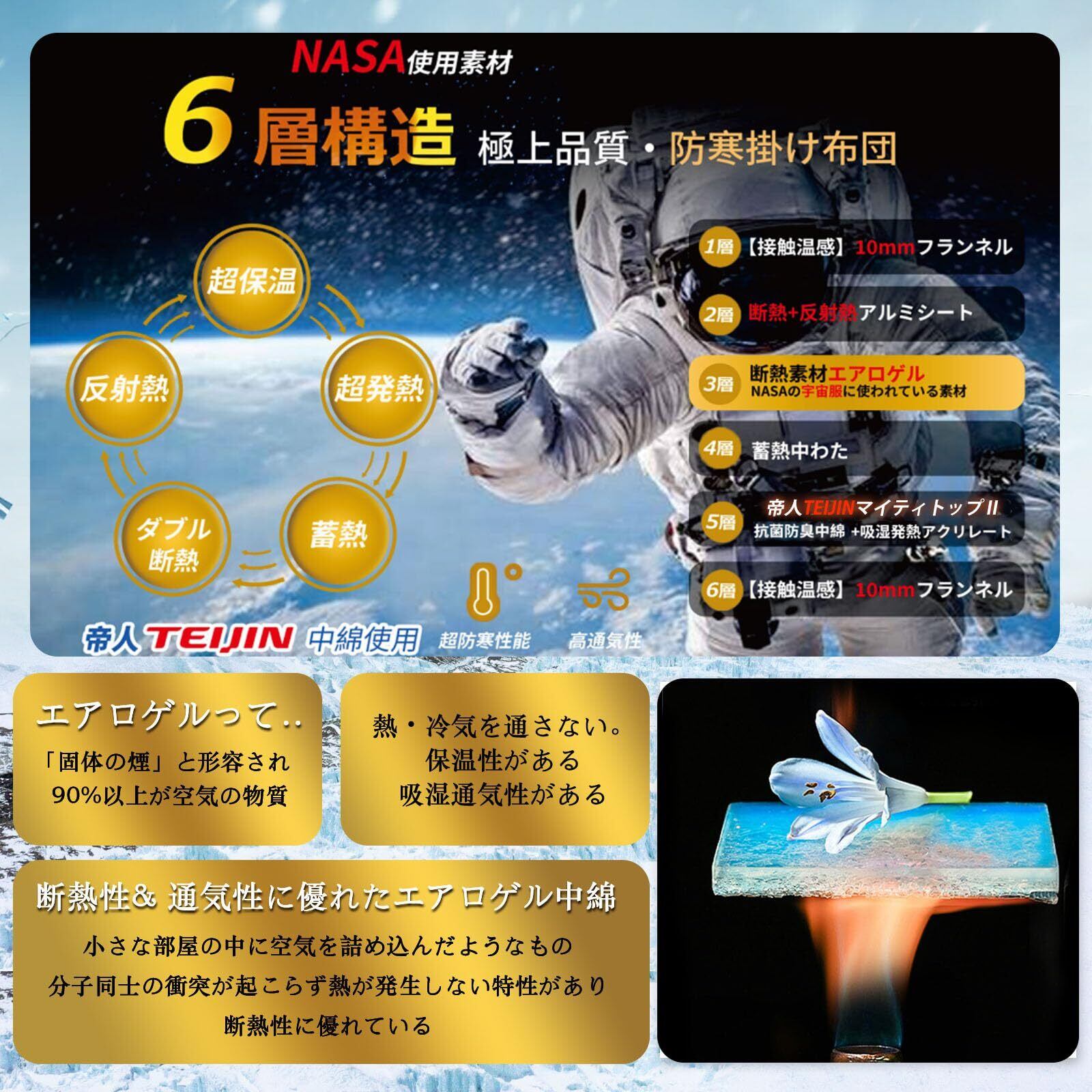 【NASAの宇宙服に使われる断熱素材】この掛け布団が使用している『エアロゲルシート』は、NASAが宇宙空間でも断熱材として採用され、広く知られたシリカエアロゲルをさらに改良し、当社の研究所と有名な大学が研究して、独自加工した特殊生地です、断熱性に優れ、外部からの冷気を遮り、内部の熱を逃がしにくいのは魅力です。