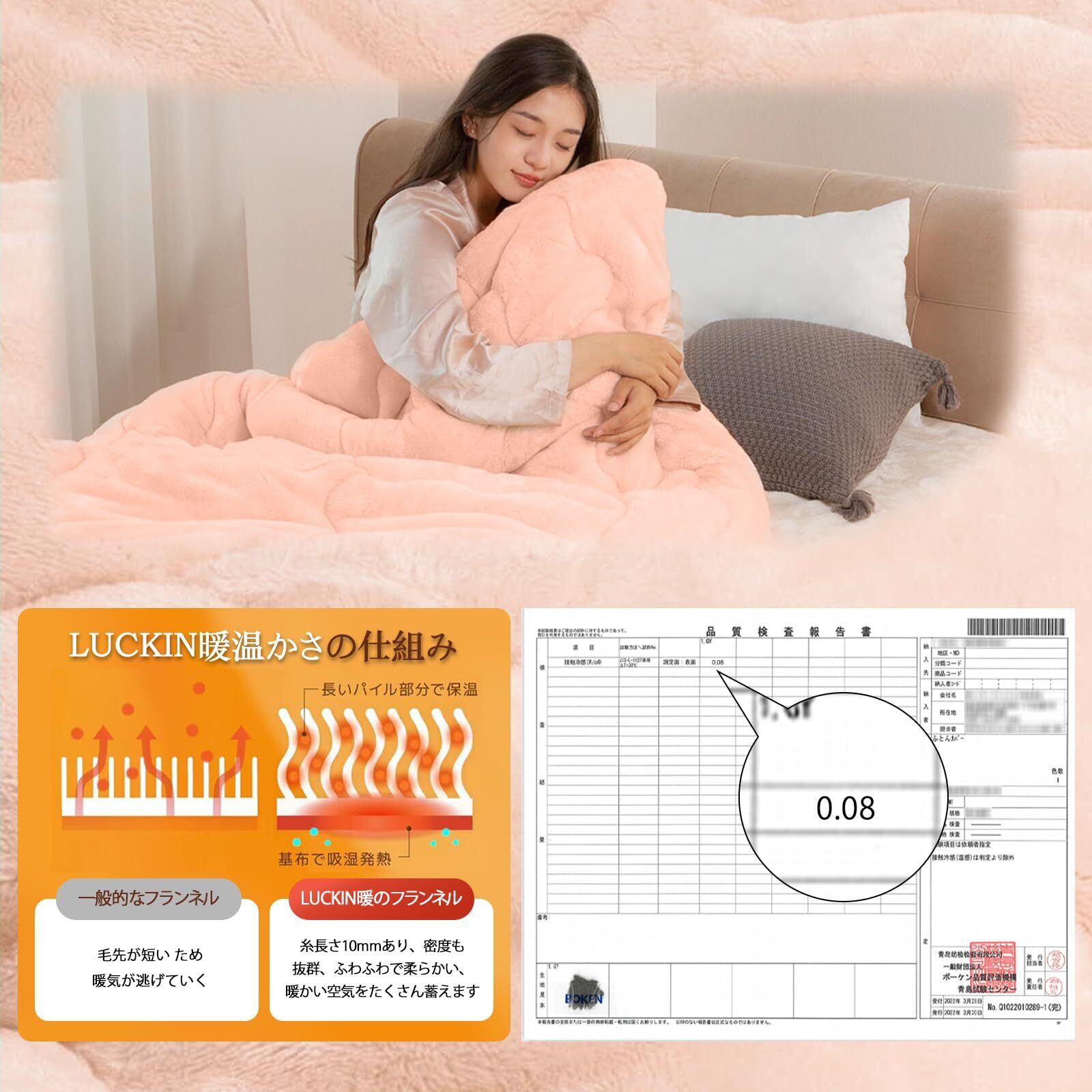 【接触温感 Q-MAX 0.08】 Q―maxとは人の皮膚からものへの熱の移動を数値化したものです、値が小さい程暖かく感じます。掛け布団の側生地は、糸長さ10mmあり、密度も抜群、ふわふわで柔らかい、暖かい空気をたくさん蓄えます。接触瞬間にあったか、ぬくぬく感じます。『LUCKIN暖』のネームを付けている面は本製品の表です。