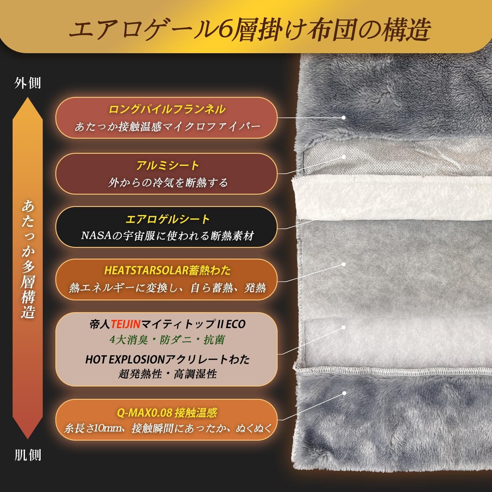 【こだわり六層構造毛布&掛け布団】①表地「接触温感」10mm ロングパイルフランネル②「冷気遮断」アルミシート③「超断熱」エアロゲルシート④「熱を蓄え・保温」蓄熱わた⑤帝人マイティトップⅡ「抗菌防臭」中綿+「超吸湿発熱」アクリレートわた ⑥裏地「接触温感」10mm ロングパイルフランネル。