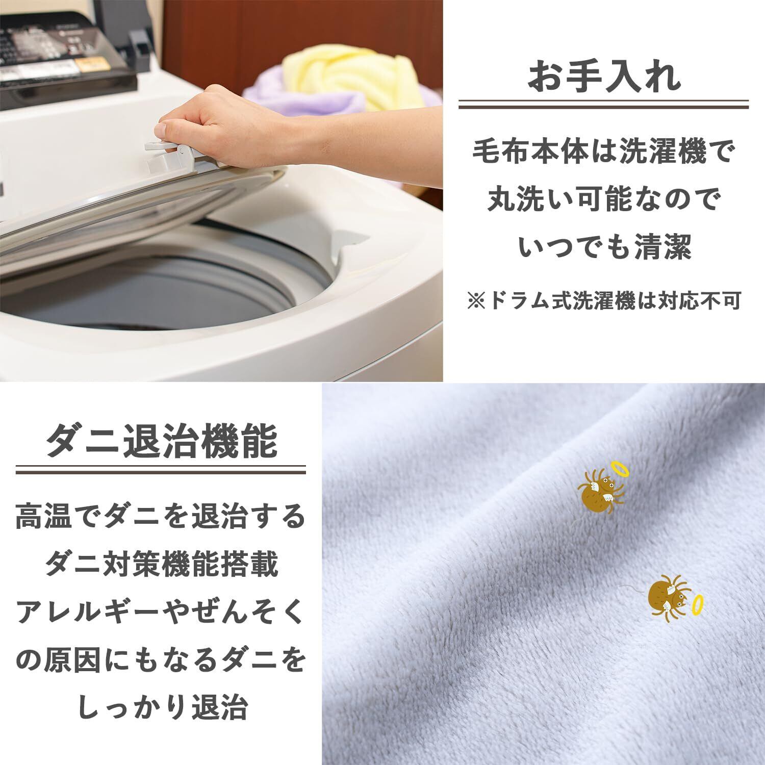 【お手入れ】毛布本体は洗濯機で丸洗い可能なので、いつでも清潔に気持ちよくお使いいただけます。コントローラーを取り外して洗濯してください。※ドラム式洗濯機は対応不可