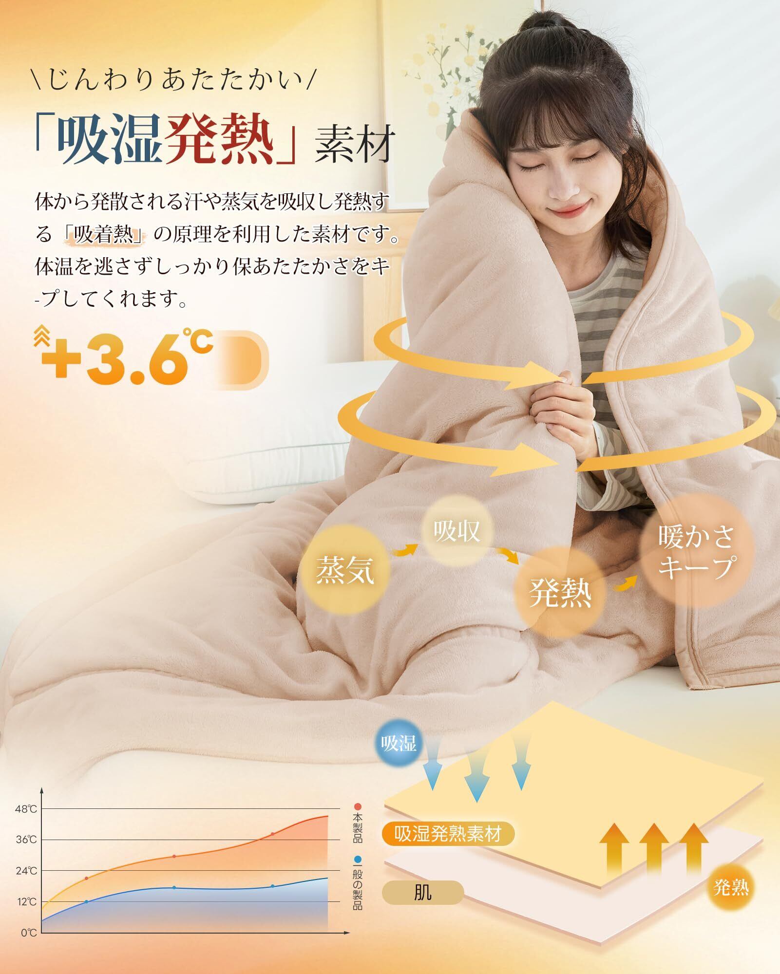 【柔らかくて通気性もよい】ブランケットの両面は超極細繊維のフランネル生地を採用しており、ミルクのように滑らかで柔らかな肌触りと高級感のある光沢を兼ね備えます。中層は吸湿発熱機能との中綿を詰めるので、体から発散する汗などの湿気を吸収しやすく、素速く乾きます。通気性がアップするので、さらさらとした睡眠環境を提供することができます。