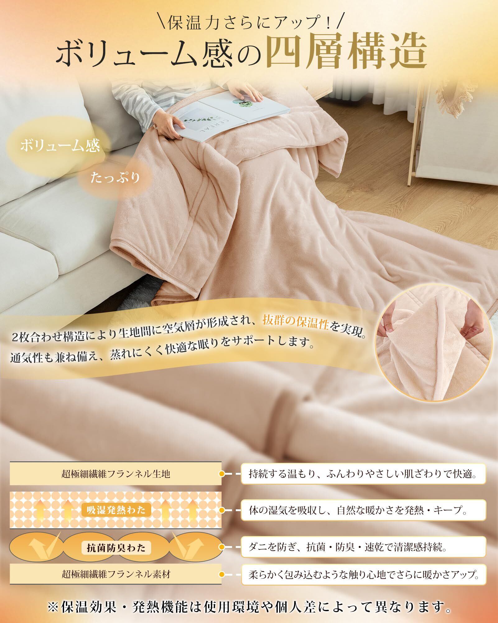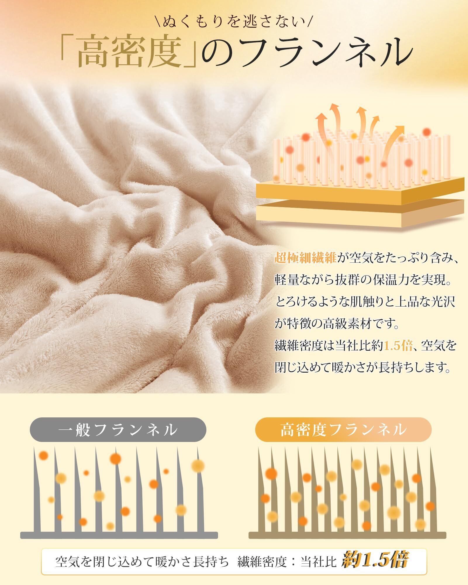 【二枚合わせ・保温力アップ】ふわふわとしたフランネル生地を二枚合わせにして、吸湿発熱蓄熱中綿を詰めた四層構造のブランケットです。繊維の高い密度で保温性に優れ、暖かさをしっかりキープしてくれます。さらに、二枚合わせのフランネルで中の空気層は暖かい空気を毛布に閉じ込めて、一般の毛布より保温力が高まります。また、襟付きがありますので首元まで暖かいです。寒い季節にも心地良い眠りをサポートしてます。