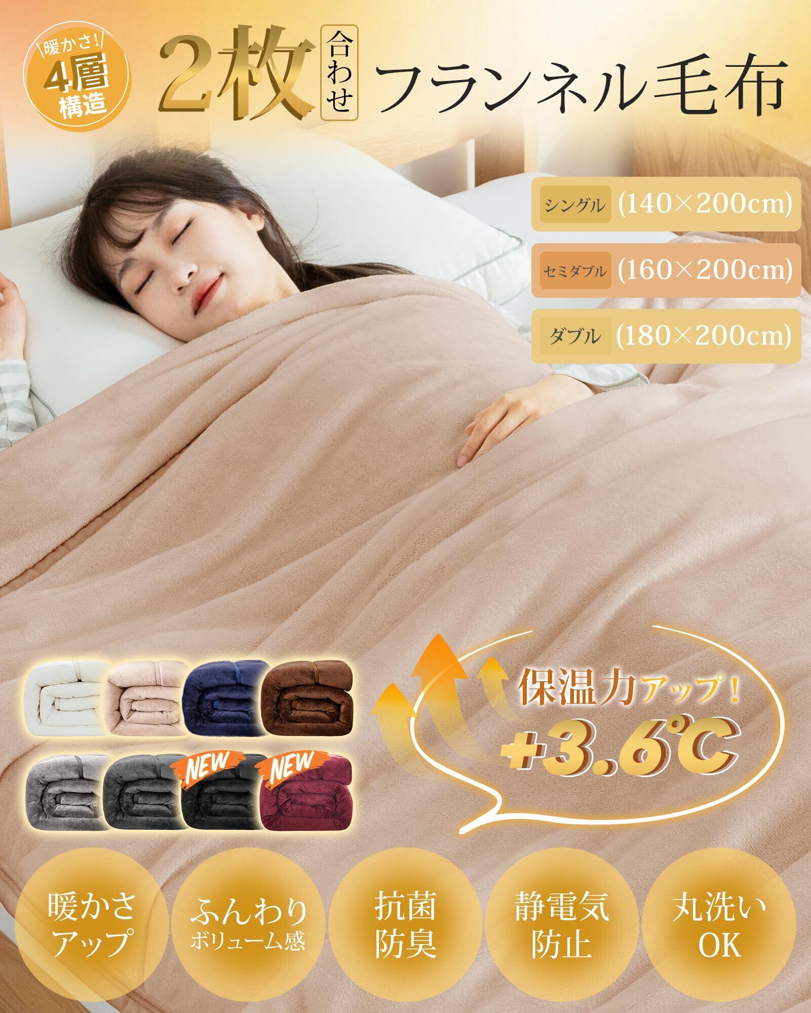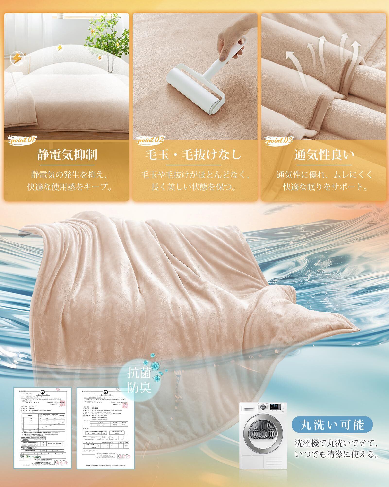 【静電気防止・ほこりが出にくい】静電気防止加工をしておりますので、冬場に空気が乾燥してもいやなパチパチ静電気を有効的に防止することができます(※ご注意:静電気の発生を抑える加工で、静電気を完全に除去することができません)。起毛部分がほつれにくくて抜けにくい・ホコリが出にくいので、洗濯機での丸洗いができます。受け取ったばかりの毛布には、浮いた毛がある場合がありますが、これは正常状況です。使用前に一度お洗濯することをお勧めします。