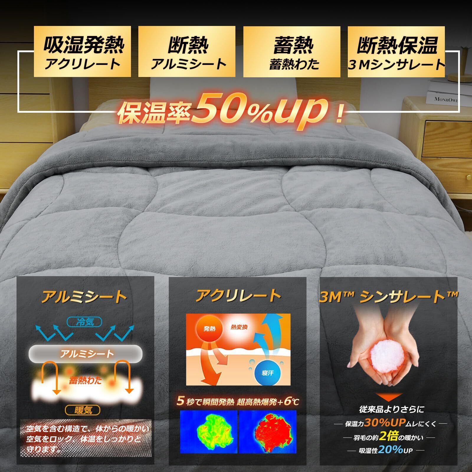 「宇宙級多重保温!暖かさ50%爆上げ革命」接触温感フランネル+最先端エアロゲル+吸湿発熱アクリレート+蓄熱綿+3Mシンサレートが織り成す最強レイヤー!冬布団は従来比保温力50%アップの極暖空間を実現。寒い夜も布団の中は別次元の温もりが持続!「寒い掛け布団に飛び込む勇気」が不要になる、人類史上最高の入眠体験を提供!