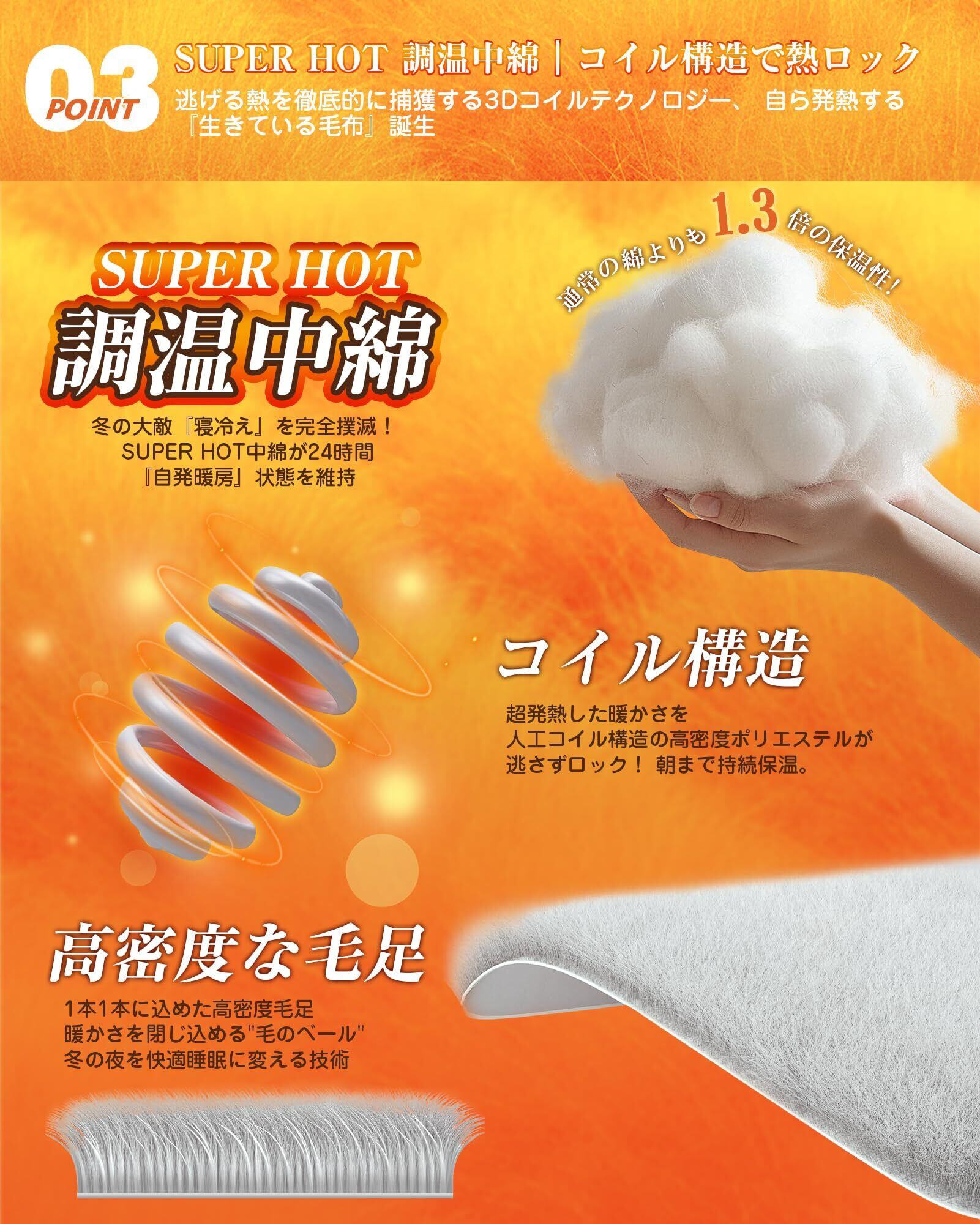 【SUPERHOT 次世代調温中綿】アメリカ発の蓄熱素材が、日本初上陸!「吸湿→発熱→蓄熱」の3段階で温度をキープ。汗や湿気を素早く吸収し、熱エネルギーに変換。特殊中綿層が“蓄熱ポケット”となり、従来素材より保温時間が1.3倍もアップ!マシュマロのようにふかふかな極厚サンドイッチ構造で、温泉のようなほっこり温もりが持続。暖かさと快適さがとことん進化した、新次元の保温体験を。