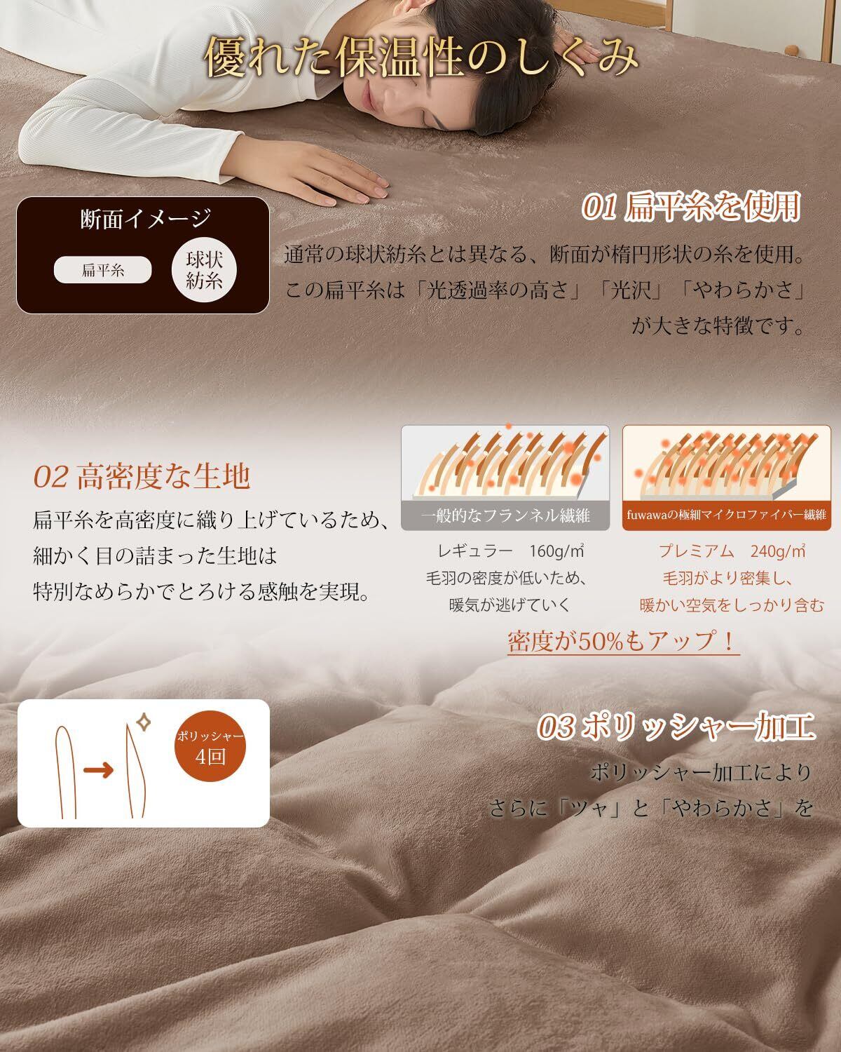 【とろけるような肌触り】肌触りを決めるのは、毛足の長さと細かさです。fuwawa布団カバーは表裏とも220g/㎡高密度極細フランネル素材を採用、きめ細かい繊維はみっちり詰まっているからふわふわ柔らか、一度触るとやみつきです。