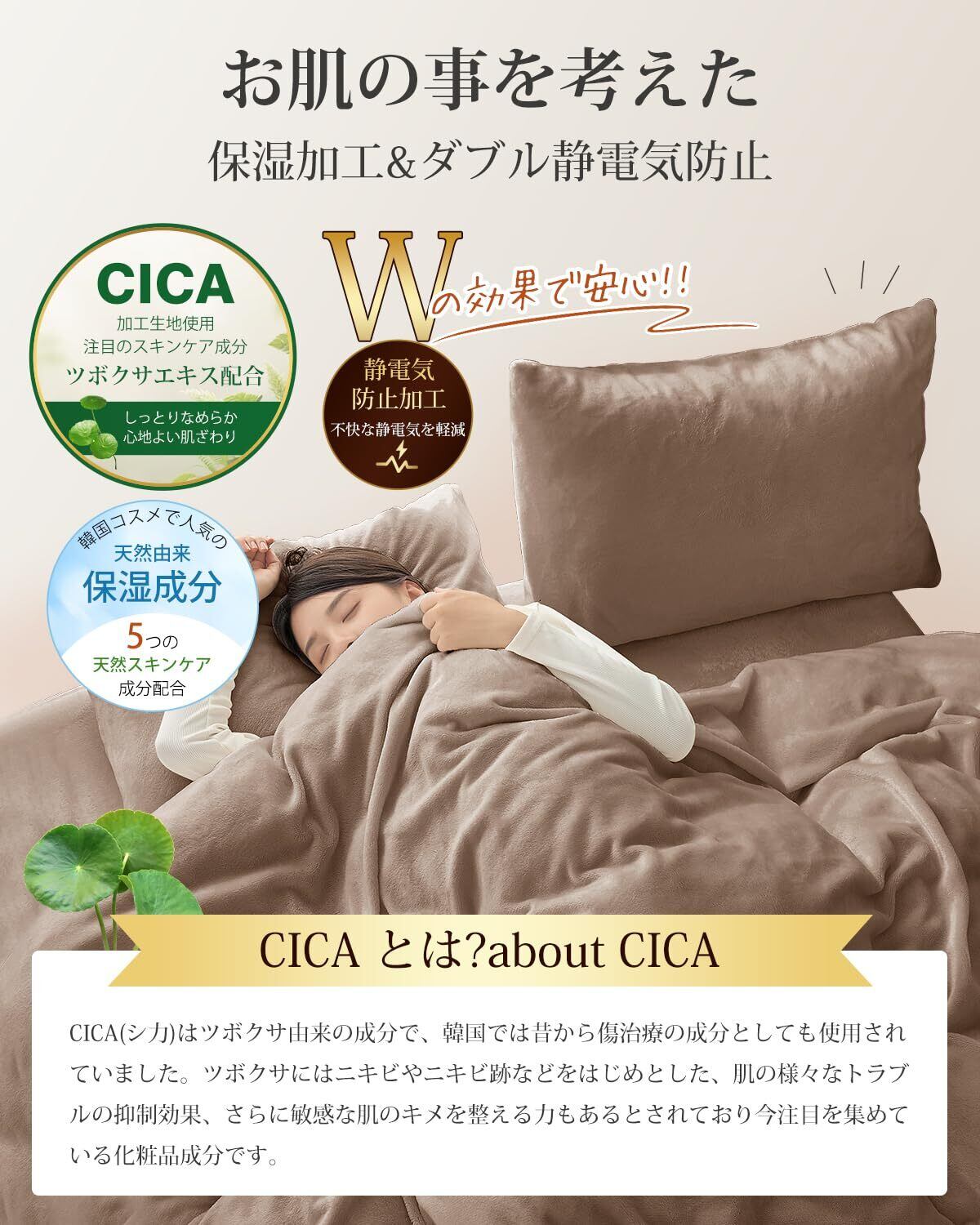 【CICA保湿成分コーティング】コスメ業界で話題のCICA(ツボクサエキス)成分を布団カバーの生地にも採用。静電気を軽減させ、ホコリや花粉等が付きにくくなっています。天然保湿成分で従来の防電気薬剤加工より長く持続します。生地の柔らかさも引き立たせ、肌の保湿・肌荒れ防止にも役立ちます。