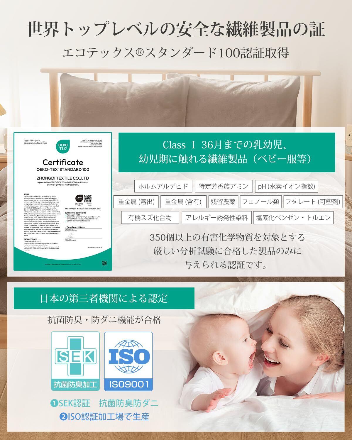 【全開ファスナー・8スナップボタン式で簡単!】片側に全開ファスナー使用、簡単着脱できます。8箇所のスナップボタンでしっかり固定します。眠っている間に動いてもズレたり丸まったりする煩わしさがありません。よりズレにくく、着脱もしやすく、お手入れが簡単なので、忙しい主婦の強い味方です。【抗菌防臭加工:99.9%防ダニ】側生地には抗菌防臭・防ダニ加工が施されており、発汗や皮脂の付着によるイヤな臭いの発生を防ぎ、清潔な使用感が続きます。抗菌防臭効果には、SEKマークを取得し、清潔さにご安心できます。