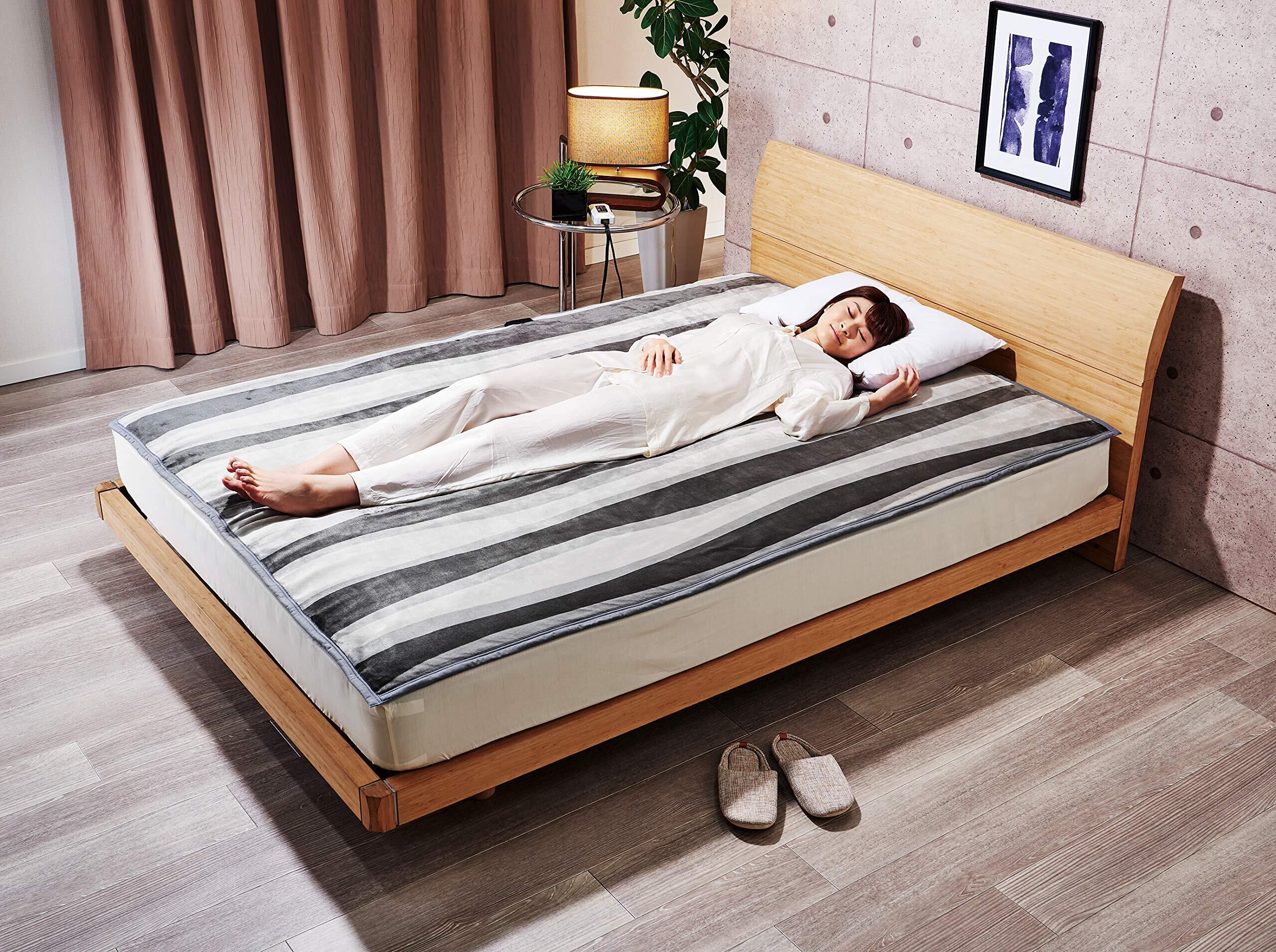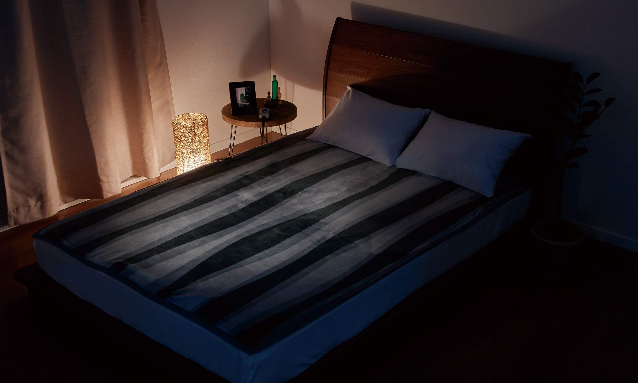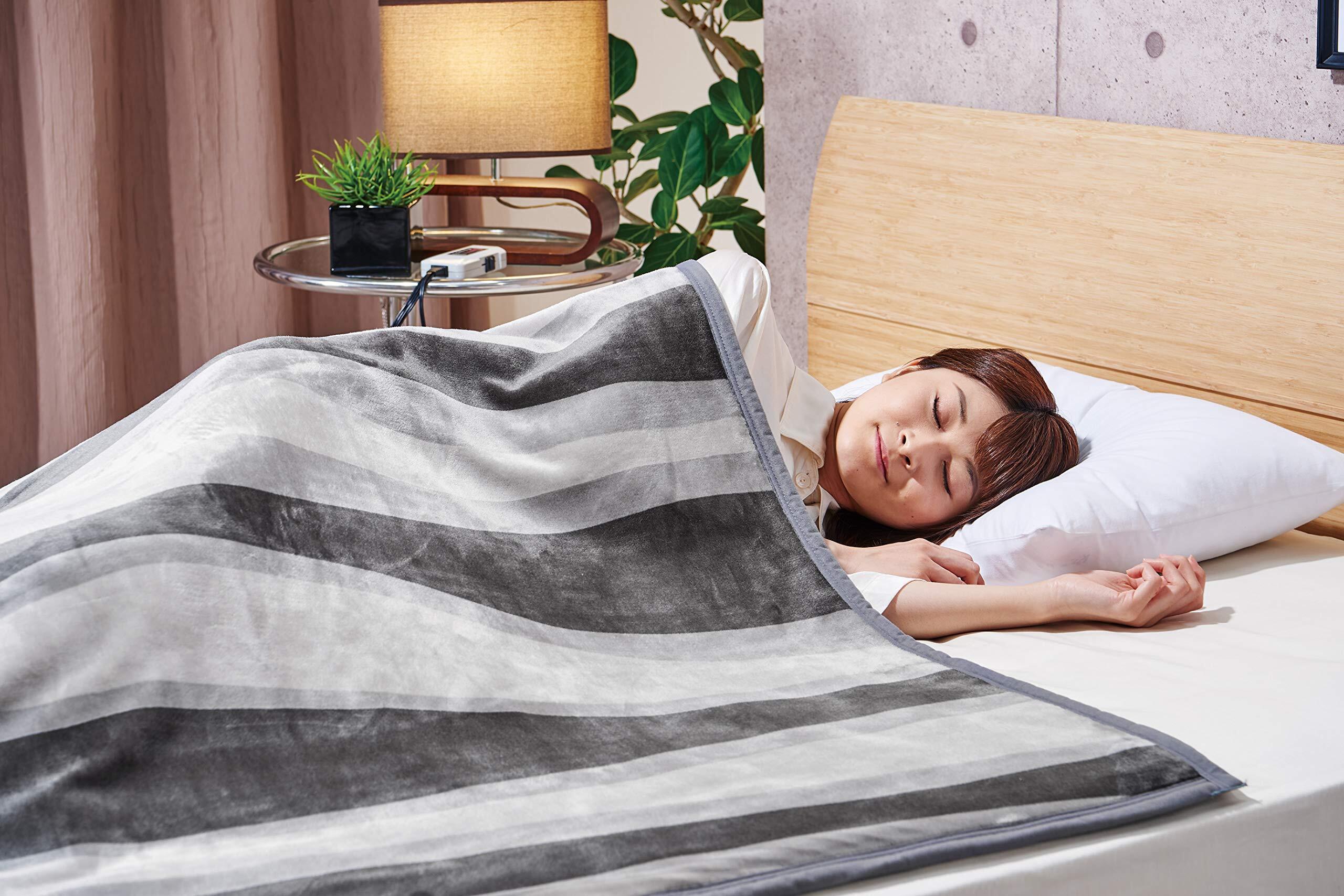 〇質感、デザイン、機能を兼ね備えた電気毛布。〇滑らかでしっとりとした肌触りが気持ちいい。毛布がインテリアに、芸術的なストライプ柄の描写はオリジナルデザイン。抗菌防臭加工・きさ。〇頭寒足熱配線で足元はしっかり、胸元はソフトに身体を暖めます。〇切り忘れても安心、12時間自働OFFタイマー付き。〇操作しやすいスライド式温度調節。(暗い部屋でも見やすいバックライト付き) 〇急に冷え込んでも快適、室温センサー内臓。(室温が約23℃以下になると、設定から自動で約3℃温度アップ) 〇取扱説明書の記載手順に従いダニ退治ができます。 〇コントローラーを外して丸洗い可能。(洗濯ネットを使用して洗濯機でも洗えます。※ドラム式洗濯機、乾燥機はご使用できません。)