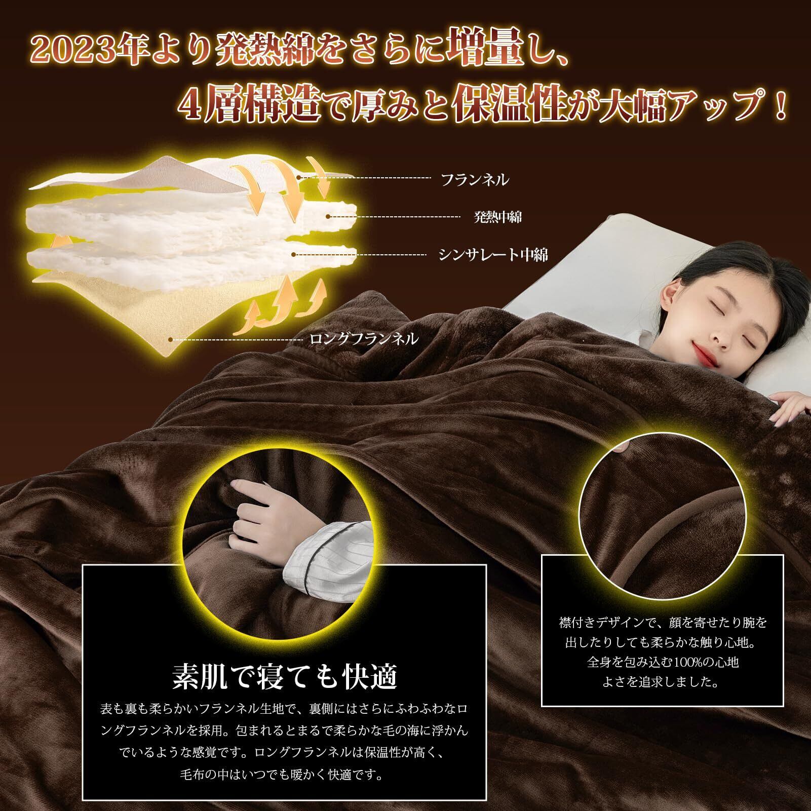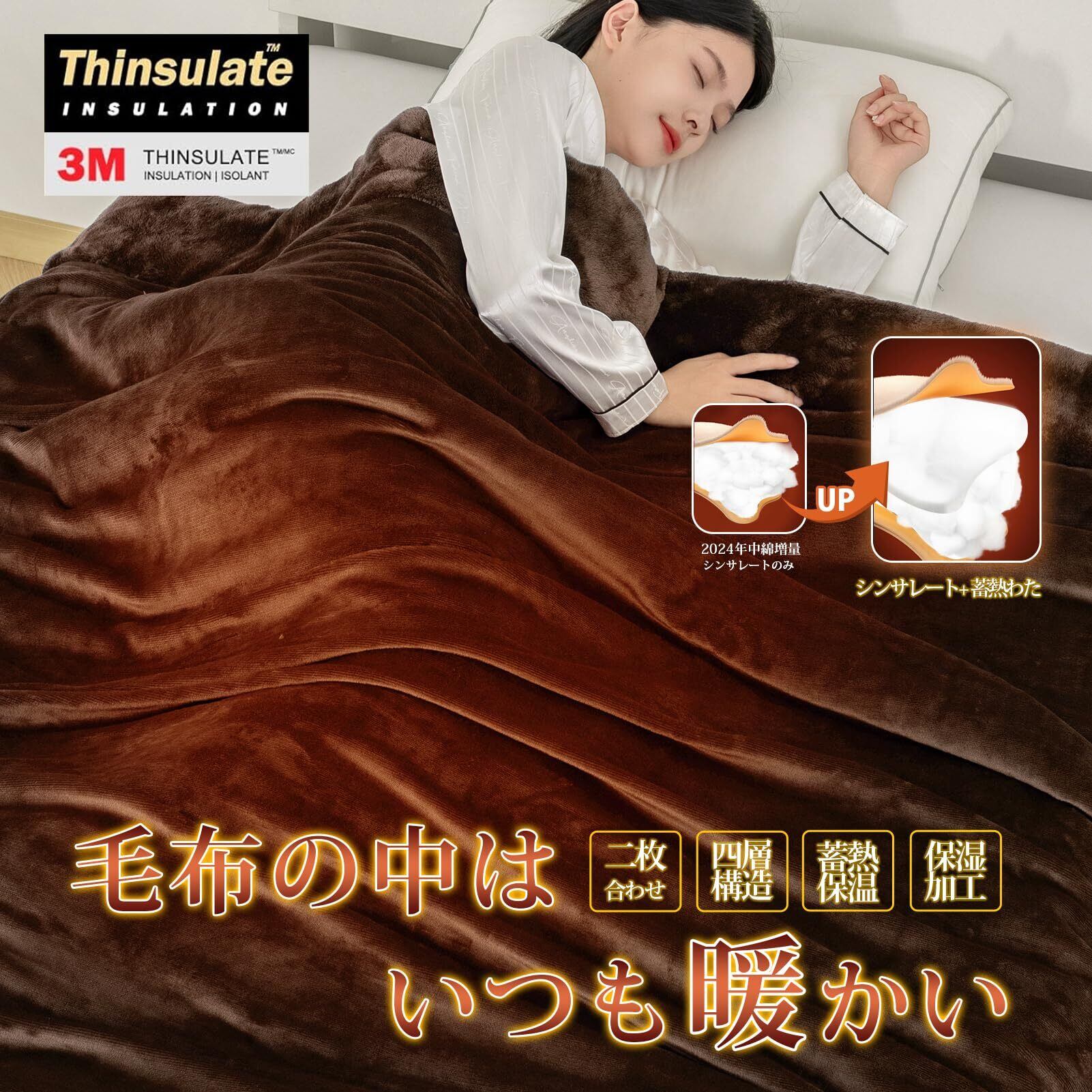 HARUMIN シンサレート 毛布 厚手【中綿増量】 冬用 シングル 掛け毛布 遠赤外線繊維 CICA保湿 洗える 四層構造 2枚合わせ 襟付き フランネル毛布 マイクロファイバー 超極細繊維 暖かい 軽量 ブランケット 断熱素材 静電気防止 吸湿発熱 140×200cm ブラウン