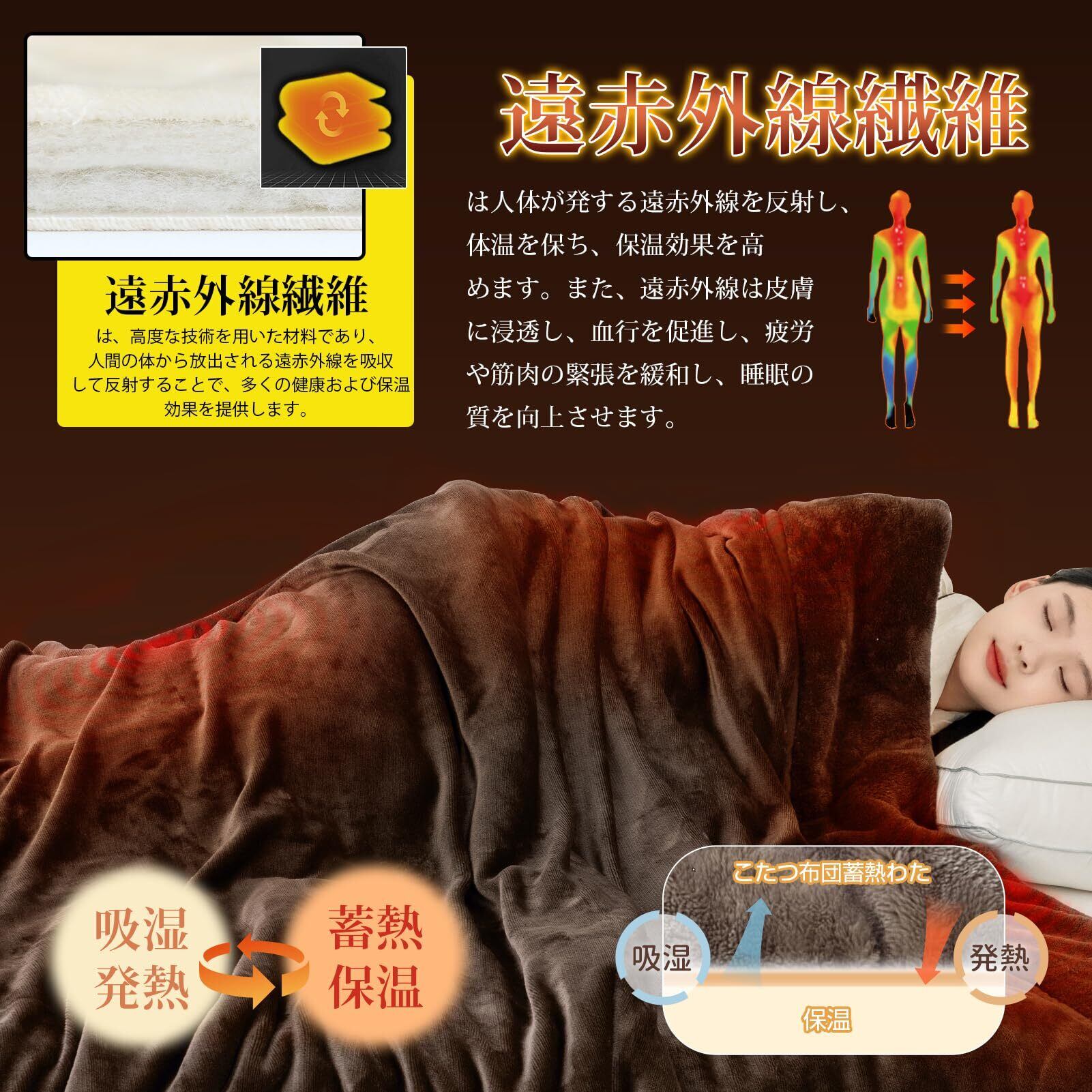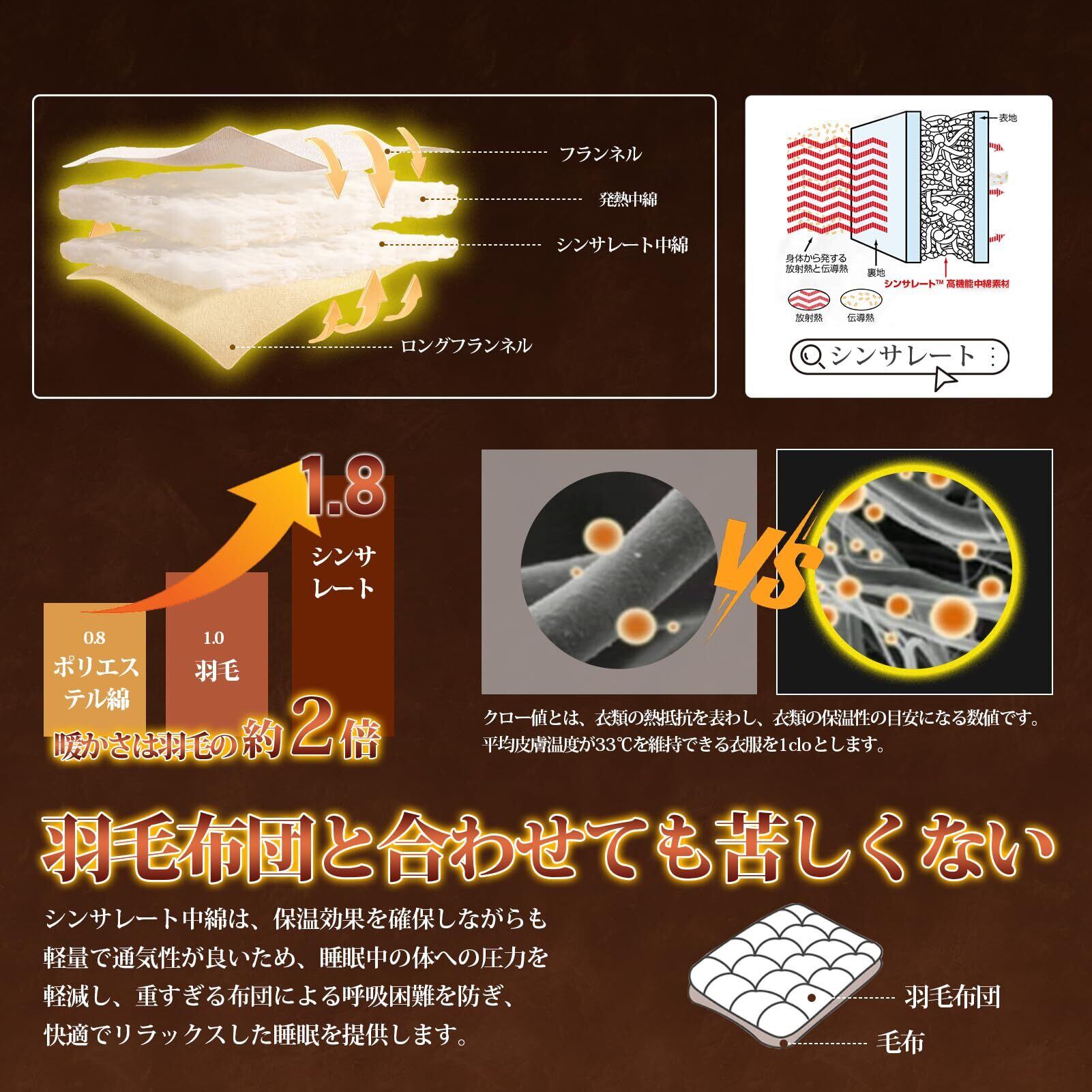 【発熱】シンサレート毛布は2024年にリニューアルされて、中綿が増量。さらに遠赤外線繊維(膝サポーターや保温衣に使われる素材)が混紡されて、体の熱を吸収して反射し、保温効果を高めます。遠赤外線は血行を良くし、筋肉の疲れを和らげて、睡眠の質もアップします。