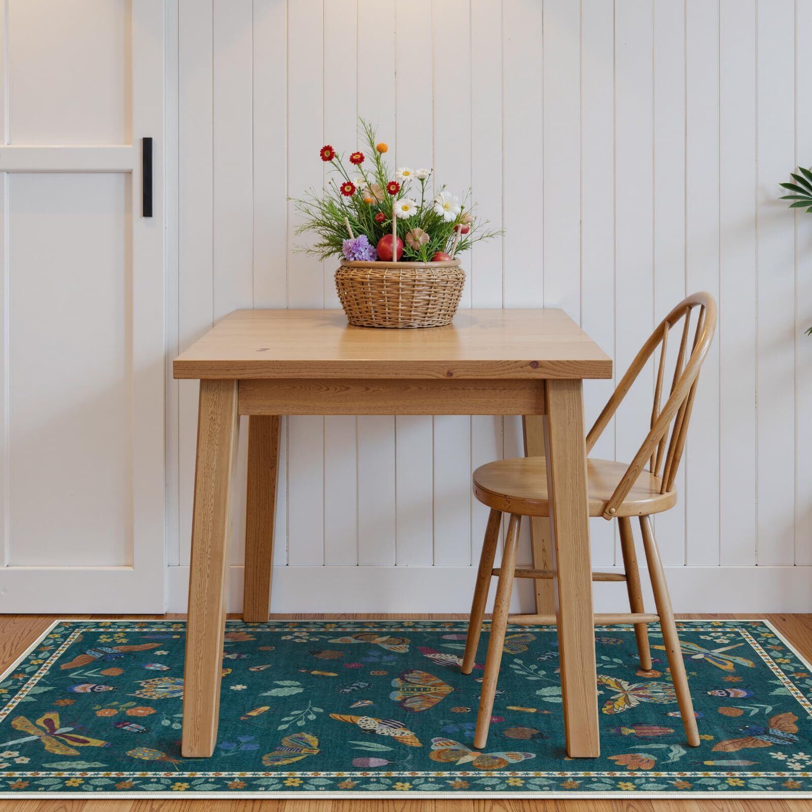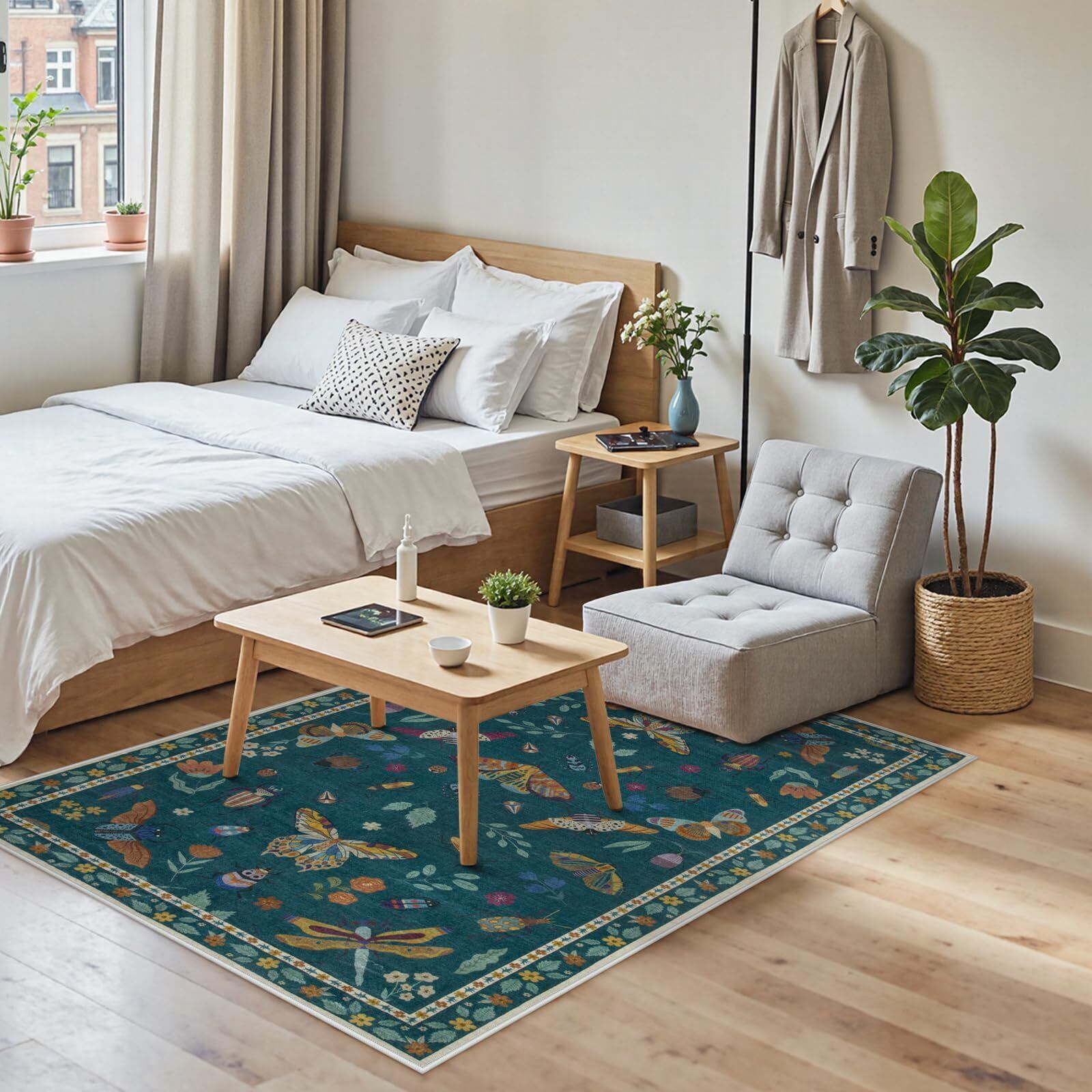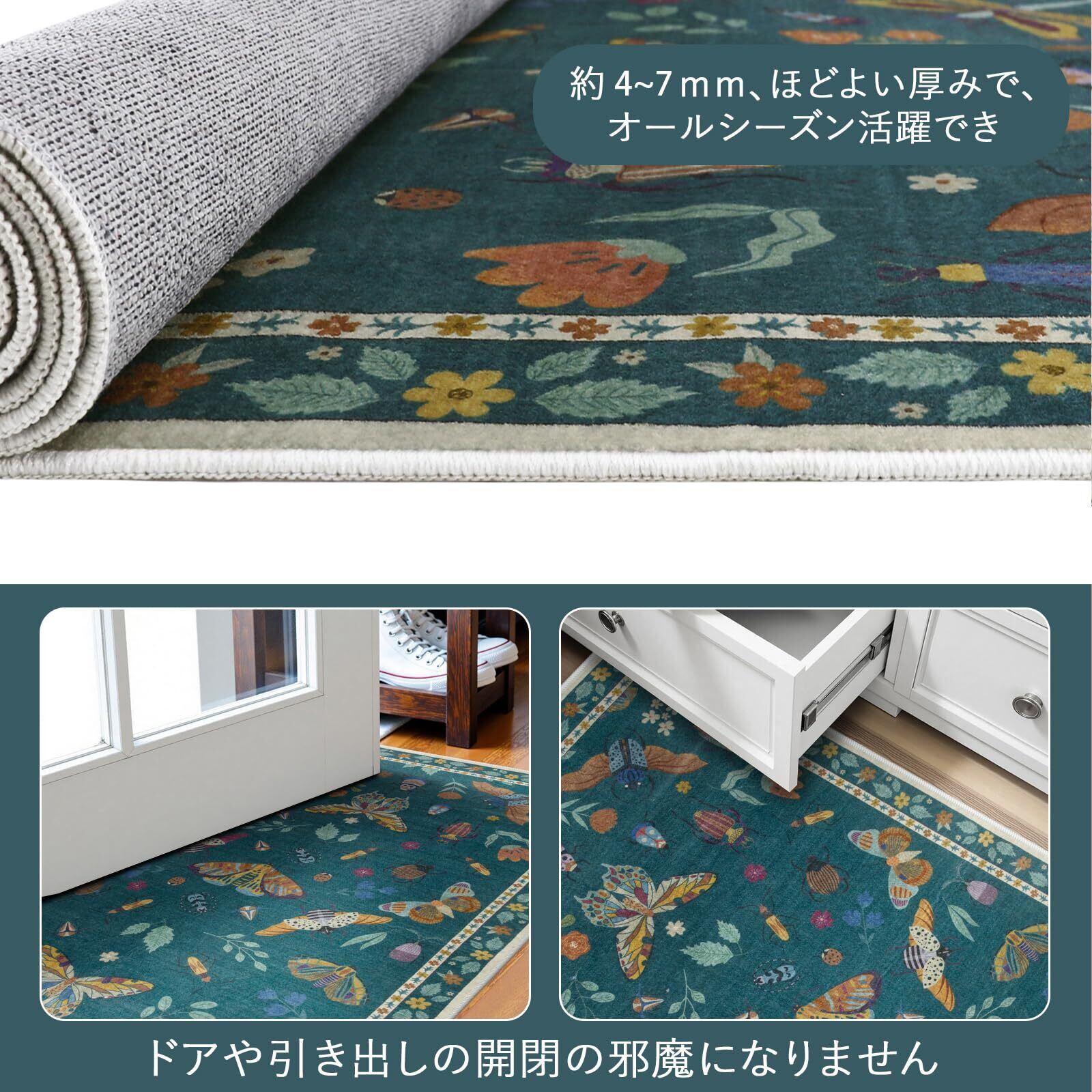 HAOCOO ラグ 洗える 約1畳 90х150cm 薄手 カーペット モダン ふわふわ 滑り止め 防音 抗菌防臭 リビング ダイニング ラグマット オールシーズン適用 花 蝶 トンボ 昆虫 動物柄 ダークグリーン | kki