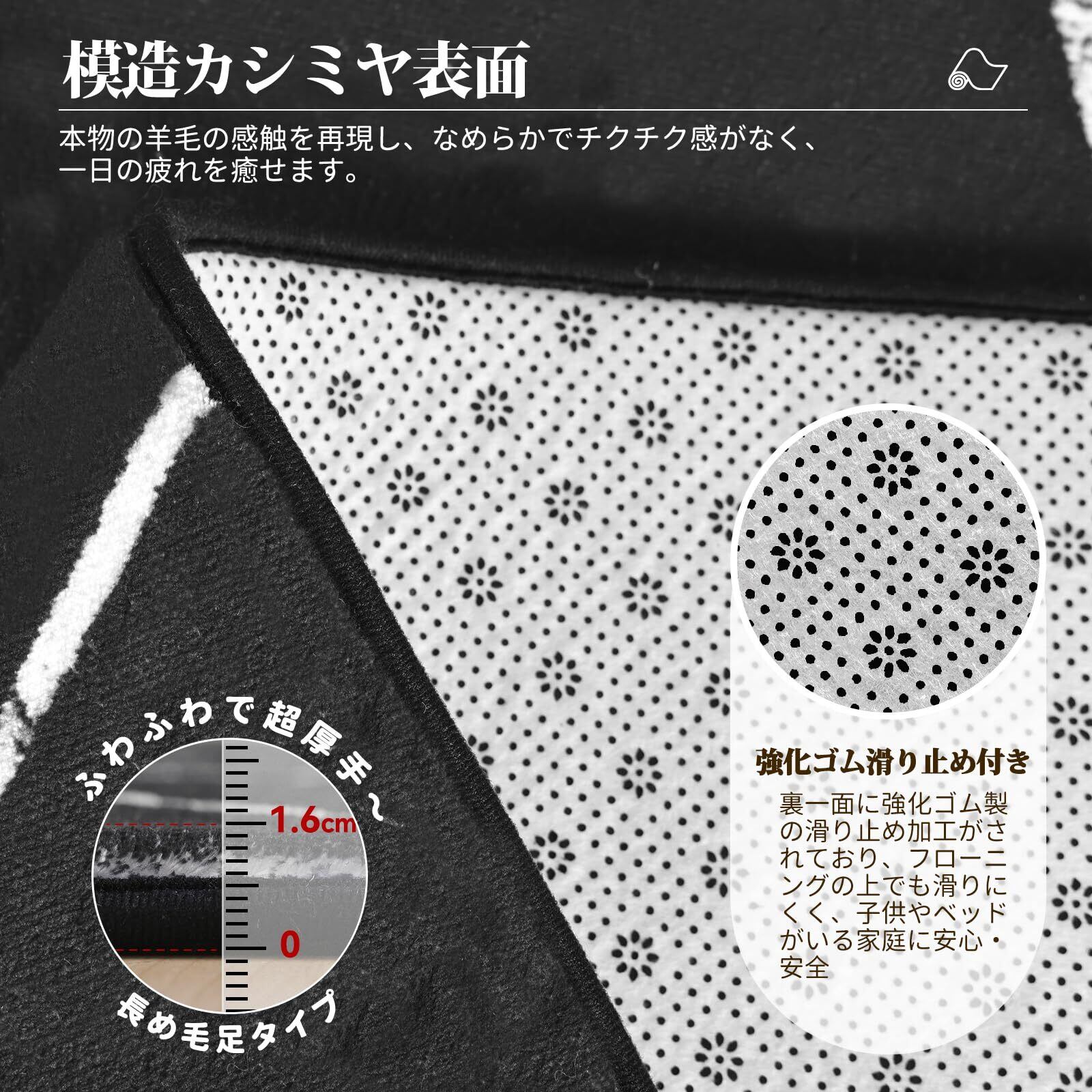 本商品のスポンジは長期間の圧縮により、開封直後に最大20cm程度のサイズ差が生じる場合がありますが、約1週間平置きすることで本来のサイズに回復しますのでご安心ください。 【北欧風厚手仕様】パイル高さ:約4mm 中層:約10mm 不織布と滑り止め加工は約2mm、合計厚さ約16mm(ブラックタイプは低め)です。表地:ポリエステル70% アクリル30% 中層:ポリウレタン100% 裏地:不織布100%(滑り止め付き)。