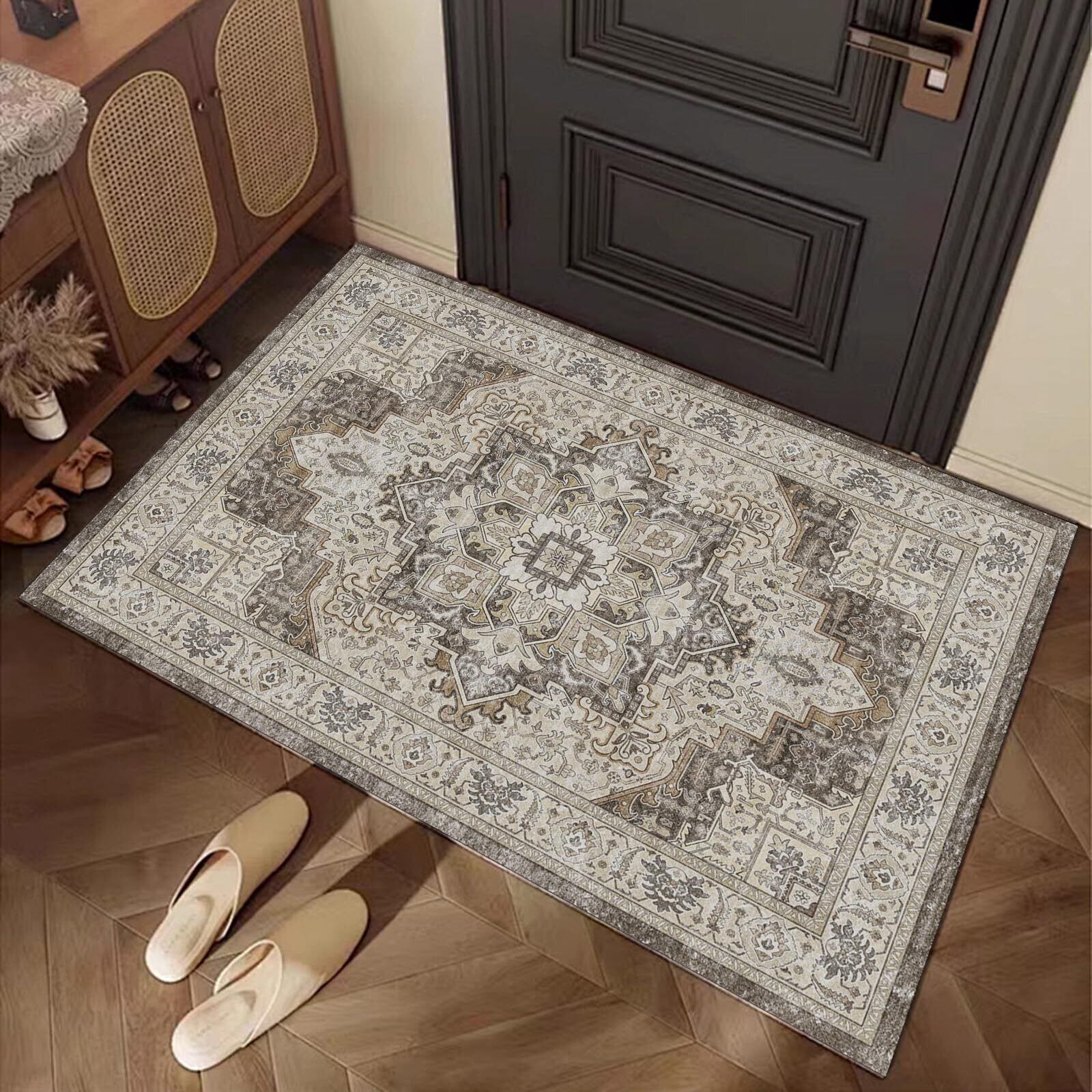 【ソフトな模倣カシミヤ】サイズ: 約80x120cm。カラー: ブラウン。原産国: 中国。高品質のポリエステル繊維で作られたカーペットは、雲のように柔らかく繊細な感触を持ち、比類のない足元の感覚を提供します。ショートパイル玄関マット 室内の厚さはわずか0.5cmで、毛羽立ちには適していません。ペルシャ絨毯は入口や家具の下に簡単に置くことができます、ドアに引っかかったり他の人につまずいたりすることはありません。
