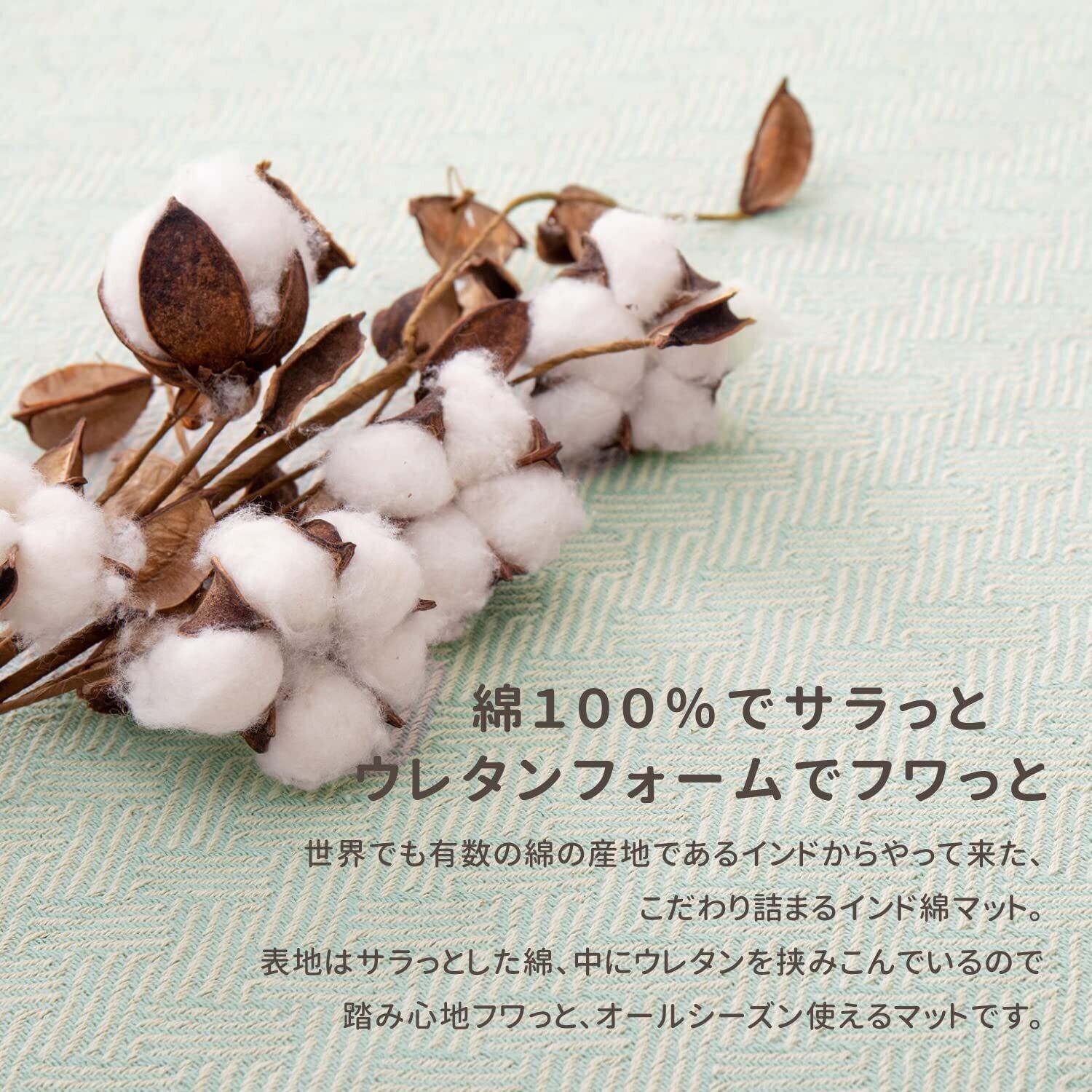 通気性の良い綿で足元さらり。年中使えるタッチ感もインド綿の人気の秘密です。ホットカーペット・床暖房対応で、併用して使えば寒い季節もあたたかく、オールシーズンお使いいただけます。裏面には滑り止め加工が施され、ズレにくく安心です。
