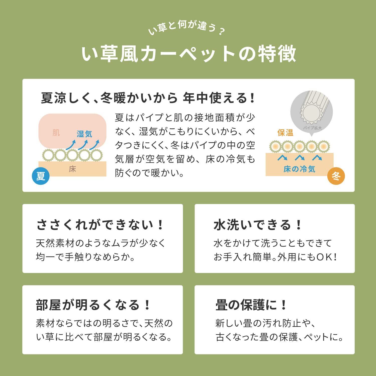 見た目は、い草の上敷きのようですが、実は、ポリプロピレン素材などを使用して織り込んだ敷物で、強度がしっかりとしています。水こぼしや汚れに強く、お手入れも簡単だから、小さなお子様やペットのいるご家庭にもおすすめです。