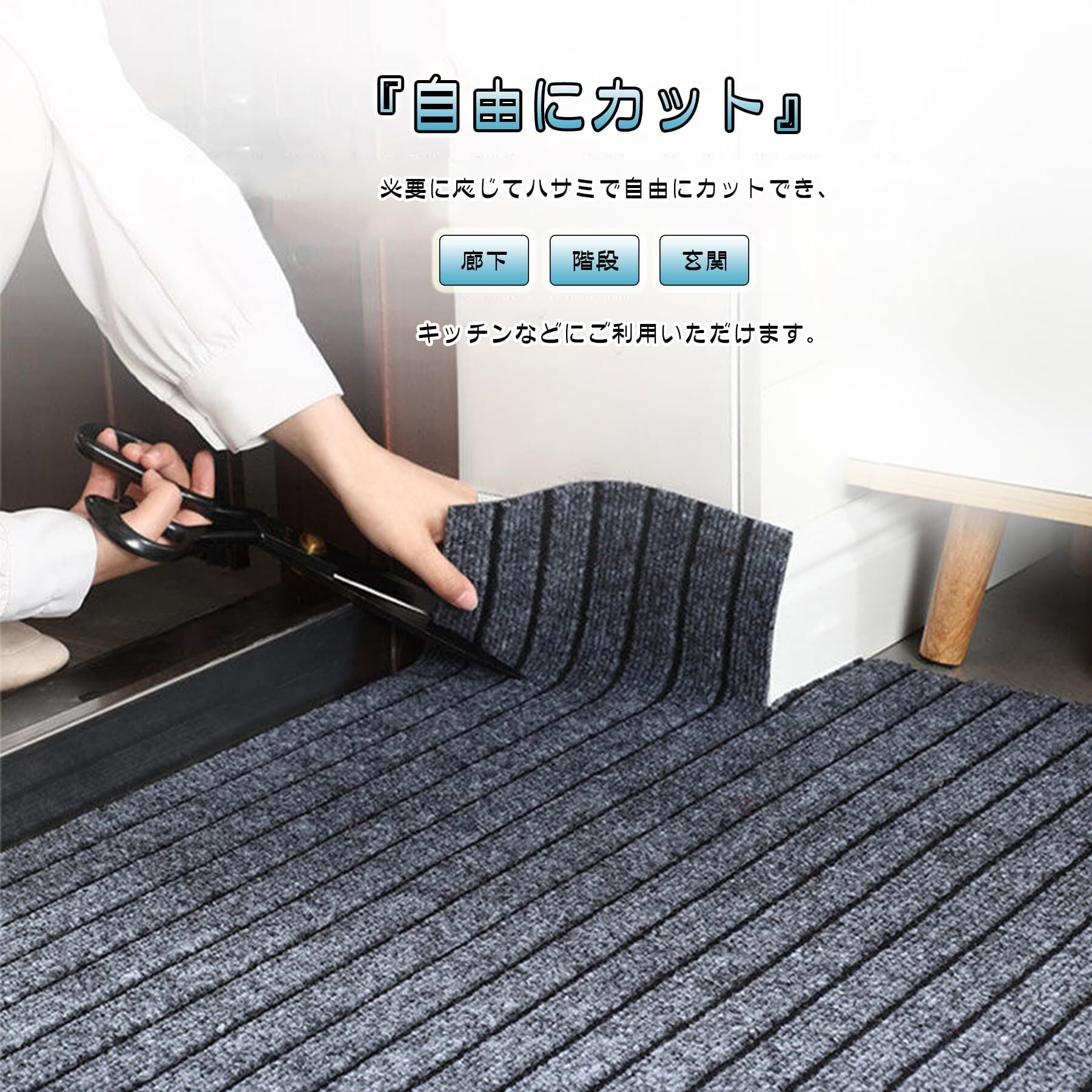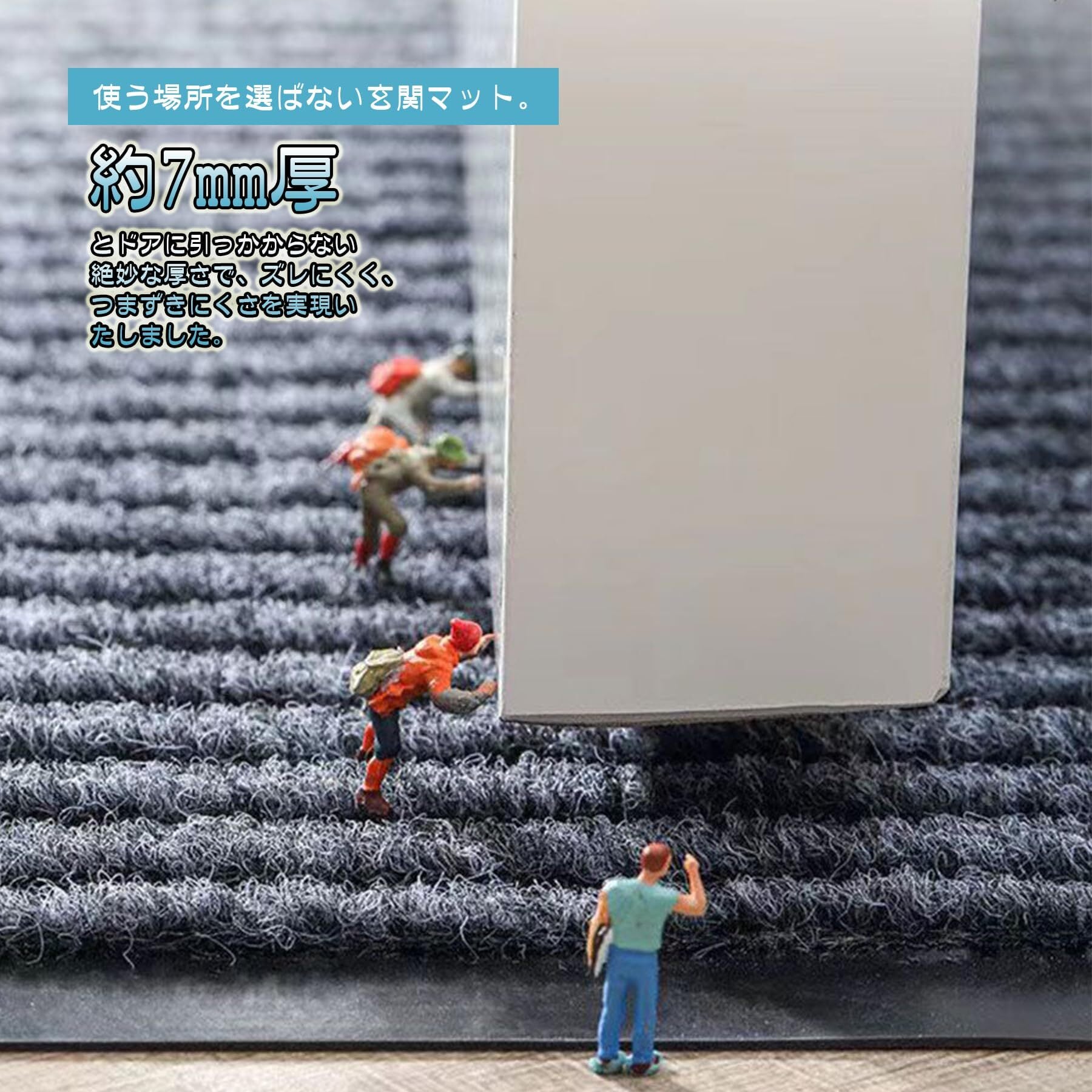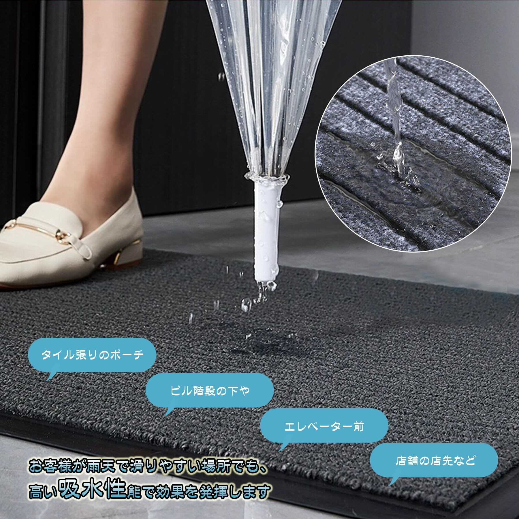 【使う場所を選ばない玄関マット。シンプルかつ高品質】多用途マットです!ドアマット、階段マット、玄関マット、キッチンマットなどのインテリアマット等、様々な使い道でご利用いただけます。飲食店や美容院、学校、公共施設、レジャー施設といった店舗など、業務用として最適です。タイル張りのポーチ、ビル階段の下や、エレベーター前、店舗の店先など、お客様が雨天で滑りやすい場所でも、高い吸水性能で効果を発揮します。一般の住宅の玄関外にマットを置くことで玄関の高級感がワンランクアップします。雪の多い地域にお住まいの方には、雪対策として、玄関内で雪落とし用にもおすすめです。毛足の強さがしっかりしているので長靴の底に付いた雪もしっかり落とせます。