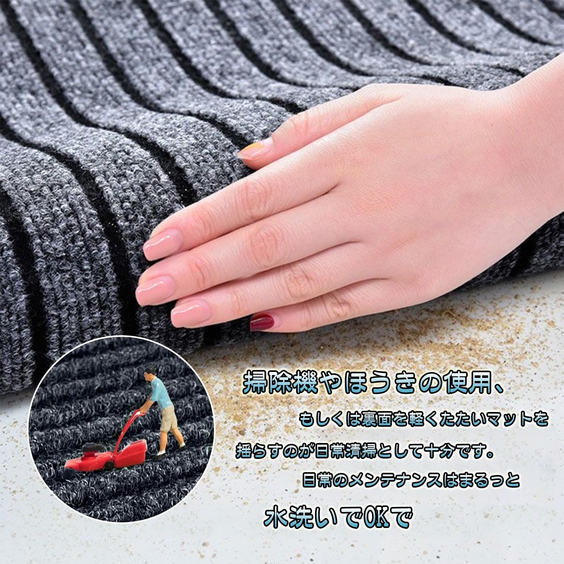 【仕様】サイズ:60cm×90cm 素材:表面ポリエステル 裏面ポリ塩化ビニル カラー:グレー 。洗濯機を使用して丸洗い可能です。注意:マットの破損を防ぐため、必ず洗濯ネット袋に入れて洗ってください。